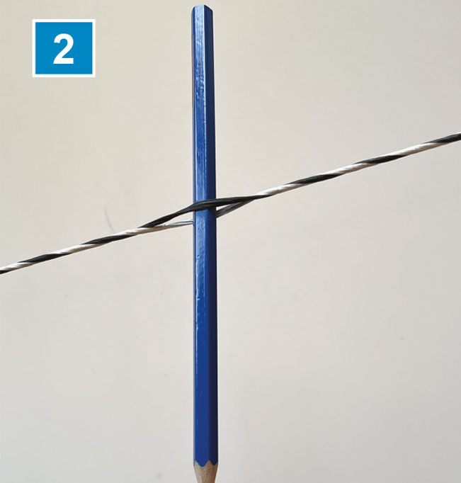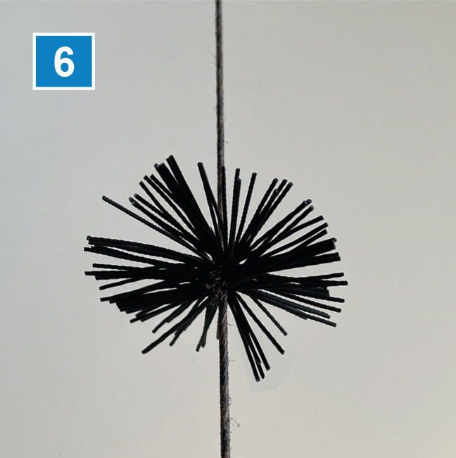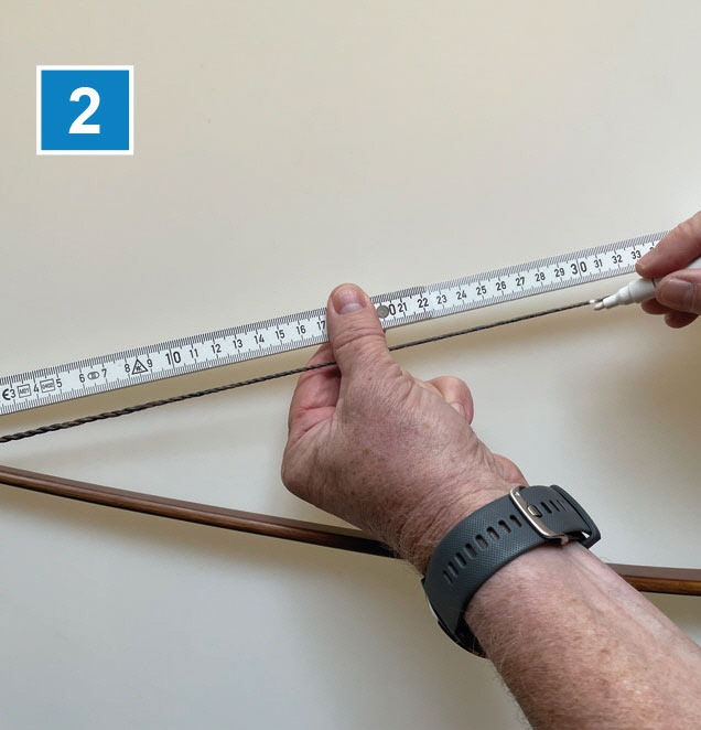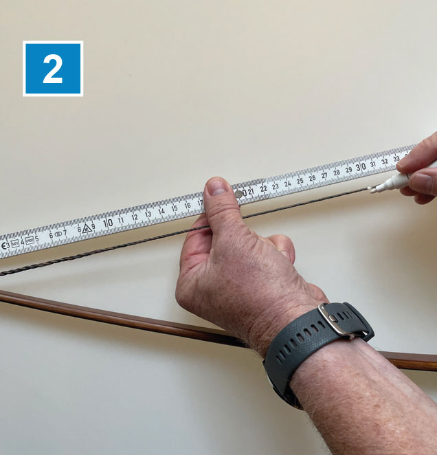 Man unterteilt nun die Sehne von der Sehnenauflage am Wurfarm in fünf und sechs Teile. Am besten bringt man nun die Sehnendämpfer ausgehend von der Sehnenauflage am Wurfarm zwischen den Knoten der fünften und sechsten Harmonischen (Schwingung) an (Bild 2).