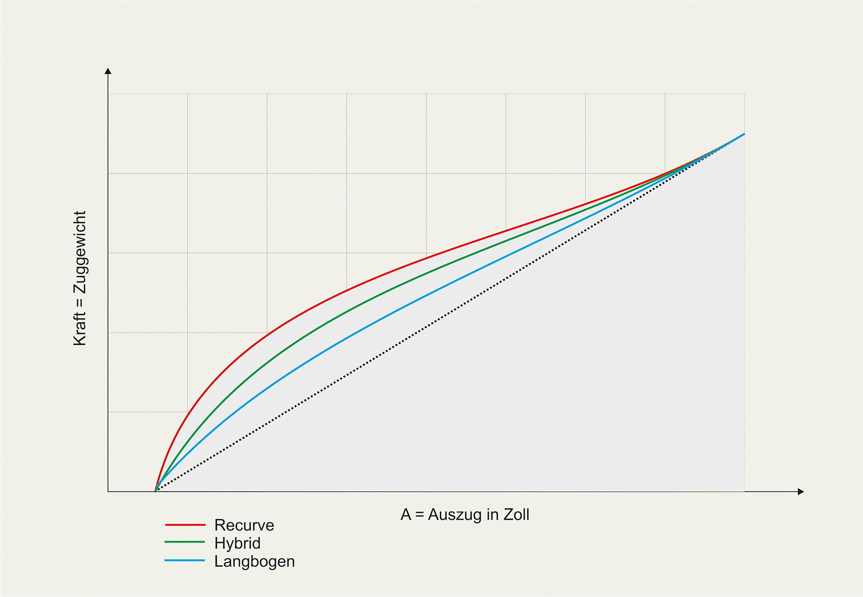 Idealerweise sollte die Kurve bei guten Wurfarmen sich bei Vollauszug an die Referenzlinie anschmiegen (Bild nächste Seite oben). Ein guter Bogen sollte zu Beginn einen steileren Anstieg dieser Kurve haben. Auch müssen sich Langbogen, Hybridbogen und Recurve unterscheiden.