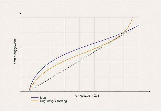 Verlässt die Auszugskurve die Referenzlinie wieder nach oben, wird der Auszug schwerer. Hier spricht man dann von Stacking. Um das zu verhindern, muss der Auszug zum Bogen passen. Wird ein Bogen zu weit gezogen, beginnt ebenfalls dieser Effekt, dass nämlich der Bogen fast nicht mehr zu ziehen ist.