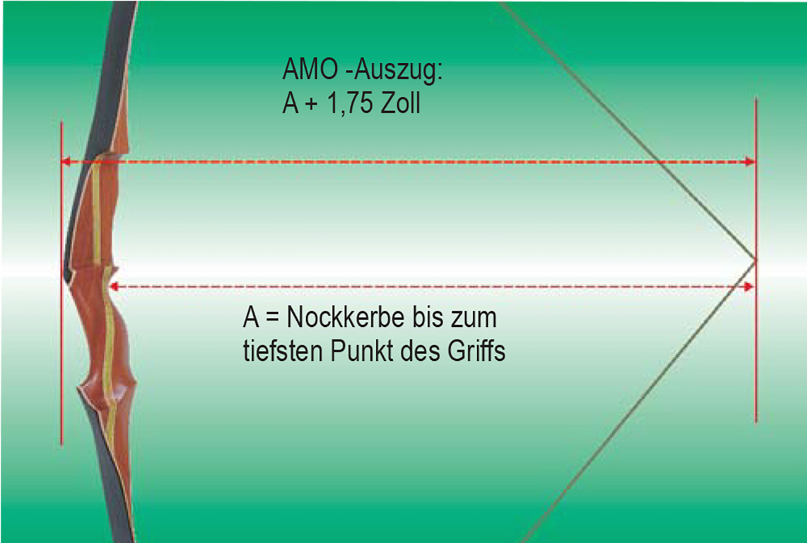 Die Auszugslänge eines Bogens wird im Vollauszug von der Kerbe in der Pfeilnocke bis zum vorderen Ende des Bogens (eigentlich ist das der Bogenrücken) gemessen. Im Gegensatz dazu verwendet die AMO eine andere Methode, bei der die Distanz von der Kerbe der Pfeilnocke bis zum tiefsten Punkt im Griff (Pivot Point) gemessen wird. Anschließend wird diesem Wert noch einmal 1,75 Zoll (ca. 4,5 Zentimeter) hinzugerechnet.