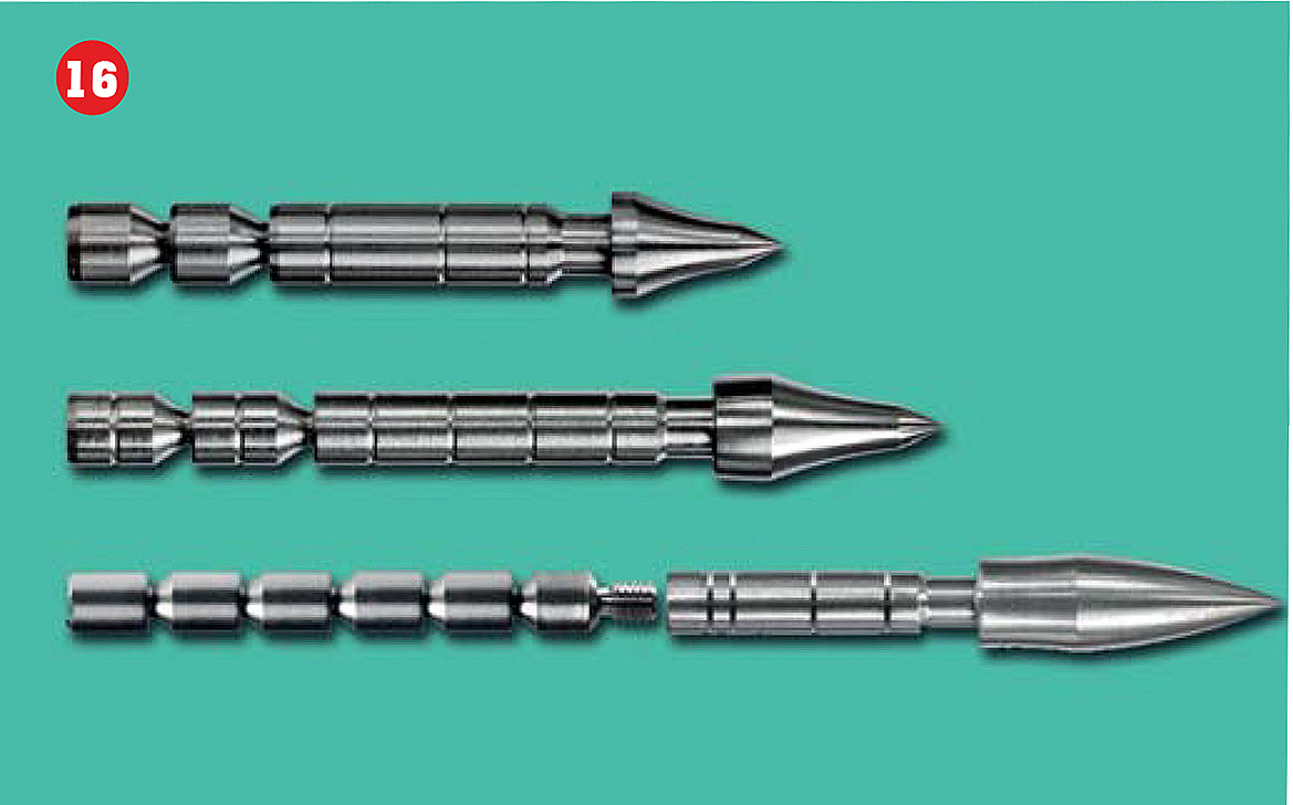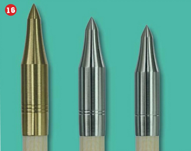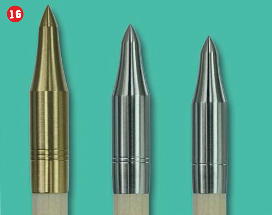 A) Holzpfeile: Hier gibt es für die Durchmesser 5/16, 11/32 und 23/64 Spitzengewichte von 70 bis 125 Grain. Einige Hersteller verwenden dabei Ringe auf der Spitze, um das Gewicht schnell ablesen zu können.