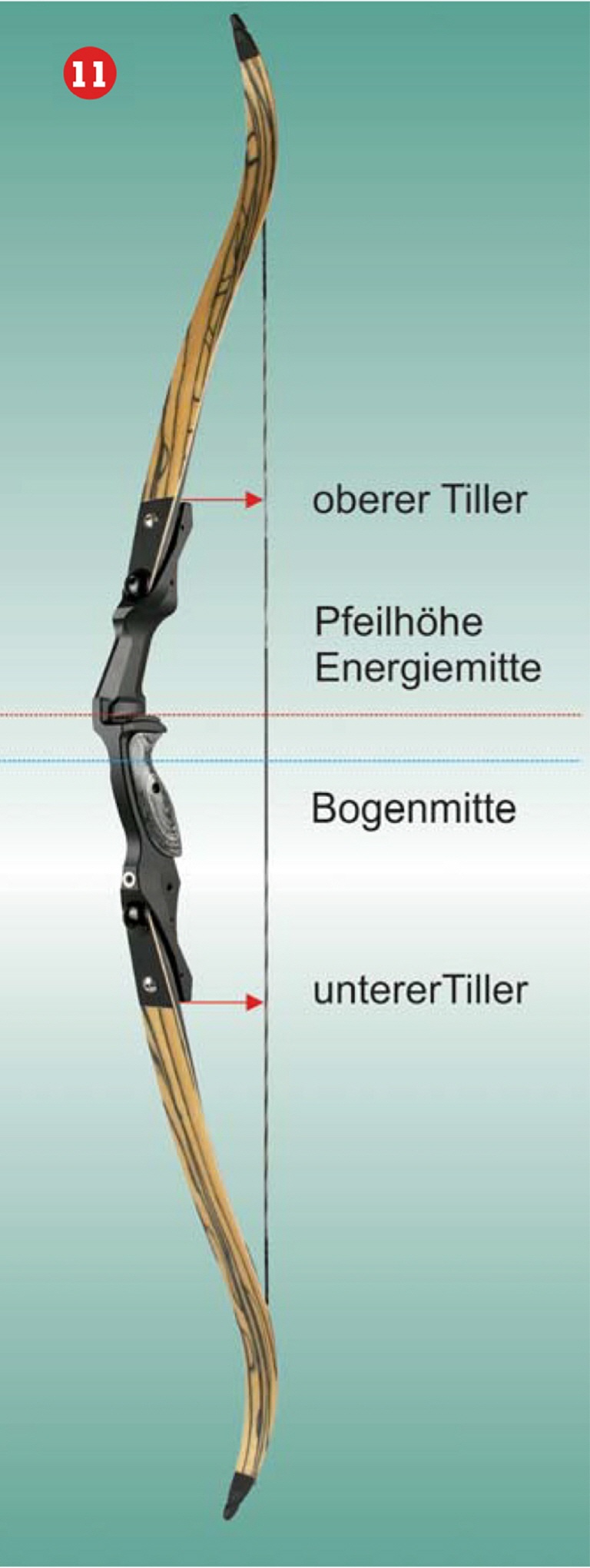 Der tiefste Punkt im Griff ist normalerweise die geometrische Mitte des Bogens. Der Pfeil liegt also über der Mitte auf der Sehne. Damit wird der obere Wurfarm mehr gebogen als der untere. Dadurch würden die beiden Wurfarme nicht synchron arbeiten. Aus diesem Grund wird beim Bau eines Bogens der Tiller entweder durch eine unterschiedliche Zugstärke der beiden Wurfarme oder durch eine Veränderung des Anstellwinkels dieser vorgenommen. Bei Langbögen oder einteiligen Recurves muss man sich darauf verlassen, dass der Hersteller alles richtig gemacht hat. Bei Bögen mit einer eigenen Konstruktion für die Wurfarmaufnahme hat man ebenfalls selten die Möglichkeit nachträglich noch Feineinstellungen zu machen. Das geht eigentlich nur bei ILF-Systemen, wo der Anstellwinkel der Wurfarme fein eingestellt werden kann.