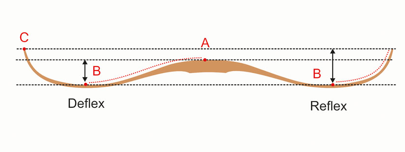 Man betrachtet den Bogen im abgespannten Zustand (Bild unten). Der Deflex wird durch den Abstand vom vorderen Ende des Griffs (A) bis zum tiefsten Punkt im Wurfarm (B) gemessen. Den Wert des Reflexes sieht man am Abstand vom tiefsten Punkt im Wurfarm (B) bis zur Sehnenkerbe (C).