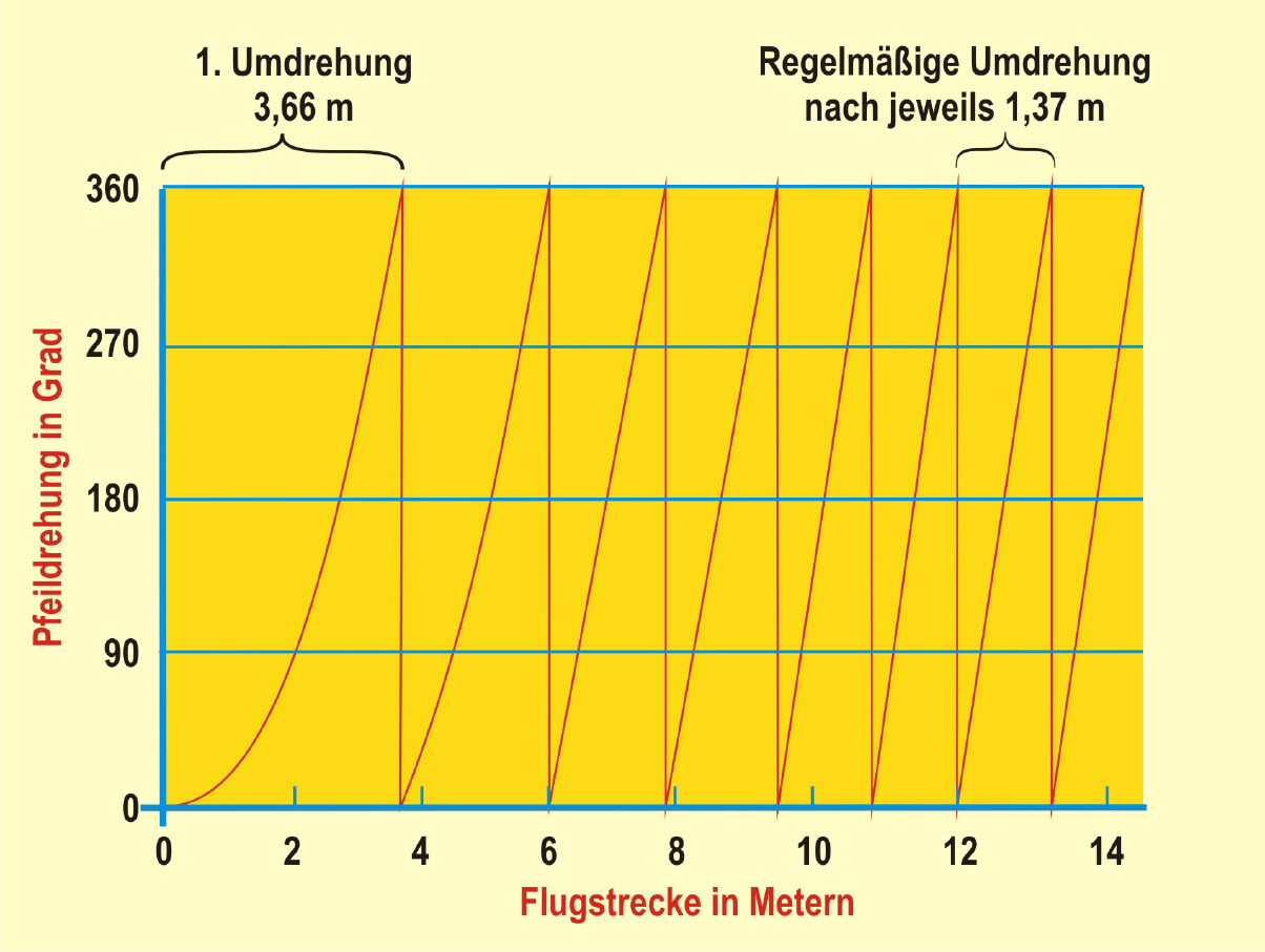 Obenstehende Grafik zeigt das Testergebnis der Firma Trueflight. Der Testpfeil wurde dabei mit einem sehr starken Drall mit einer gewundenen Klammer befiedert. Nach einer "Startphase" von rund 6 Meter rotiert der Pfeil mit 2.840 Umdrehungen pro Minute. Anders ausgedrückt: Er macht eine Umdrehung pro 1,37 Meter. Dabei hat man festgestellt, dass Pfeile mit Plastikfedern wesentlich träger sind, als Pfeile mit Naturfedern. Das hat seinen Grund in der größeren Masse der