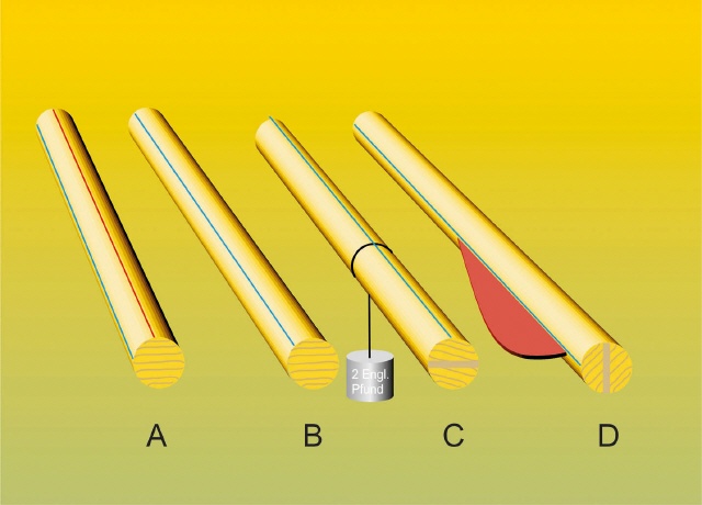 Üblicherweise geht man davon aus, dass die steifste Stelle bei einem Holzschaft parallel zu den Jahresringen verläuft. Dementsprechend wird dann auch die Nocke angebracht. Der Pfeil biegt sich dann beim Abschuss zum Bogen (Bild 2/A).