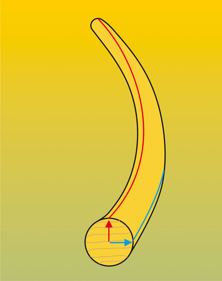 Da aber Holz nicht homogen ist, also die Dichte im Holz unterschiedlich sein kann, sollte man zuerst den „Spline„ bestimmen. Dieser muss nicht zwangsläufig so liegen. Er kann auch entgegen der Theorie an einer anderen Stelle liegen (Bild 2/B). Würde man hier nun den Spine messen, indem man die Jahresringe senkrecht ausrichtet, bekäme man einen falschen Spinewert. Das passiert bei automatischen Messungen regelmäßig.