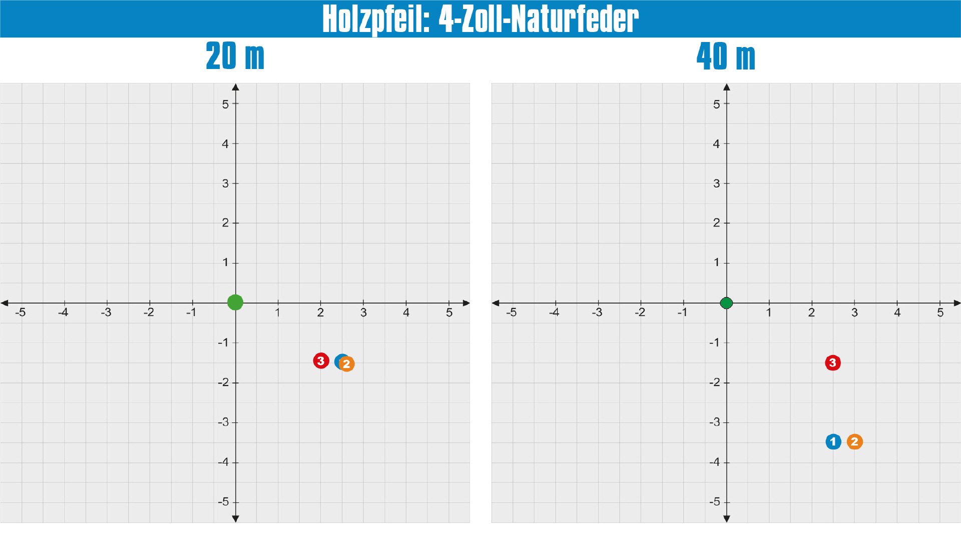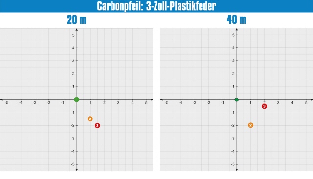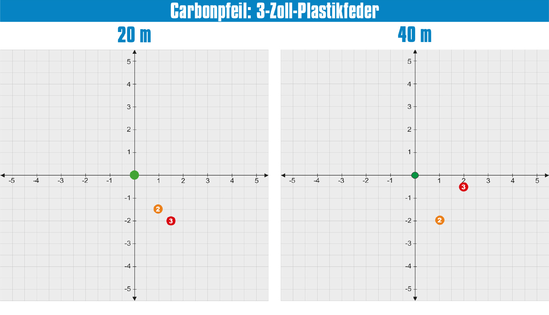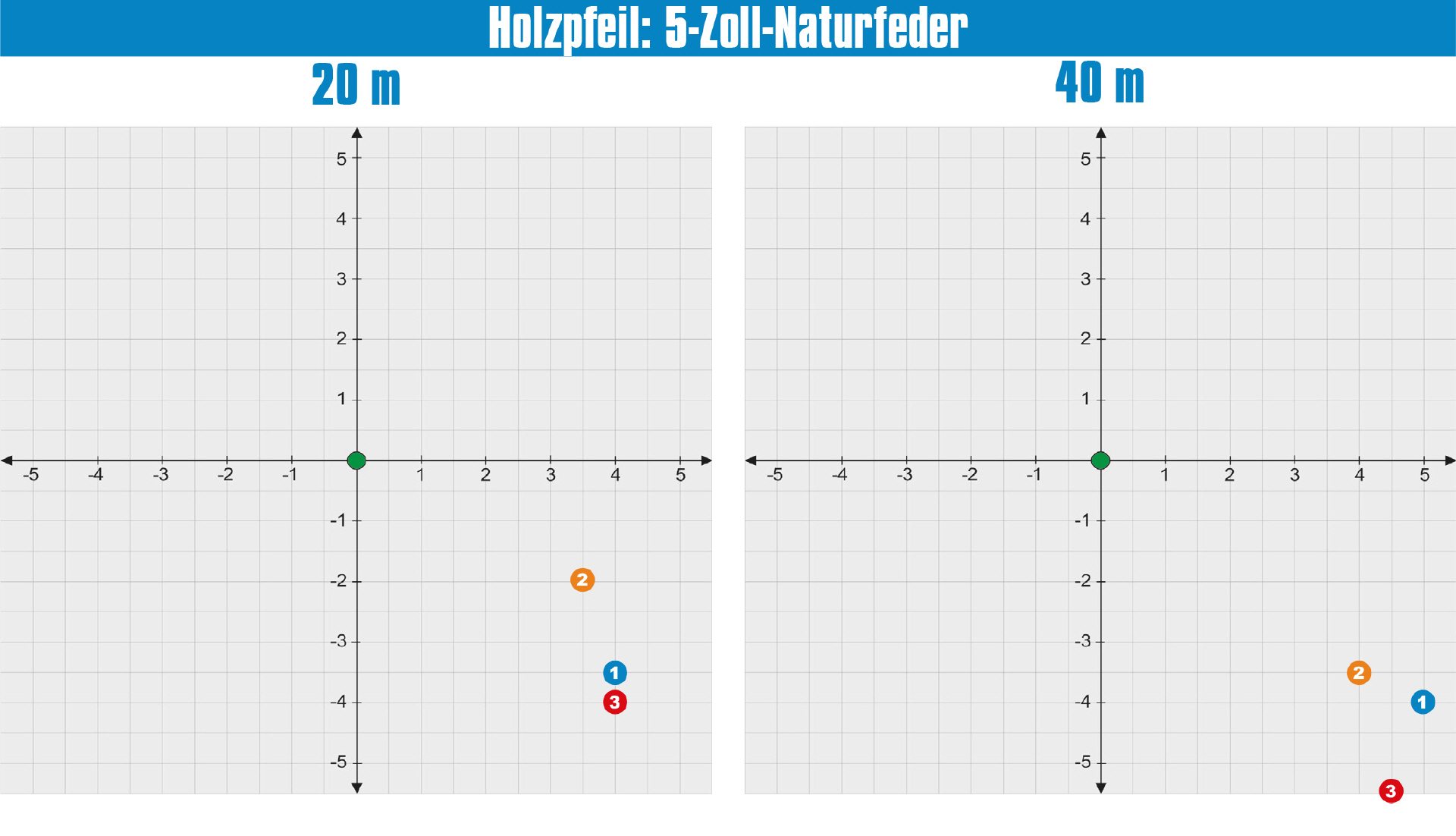 Dabei haben wir bei jeder Pfeilsorte nur zwei Pfeile verwendet. Ein Pfeil wurde nass gemacht, beim anderen Pfeil wurde eine Feder abgeschnitten und dann beim nächsten Schuss ganz entfernt. Die Abweichungen in den folgenden Grafiken sind in Zentimeter angegeben. Wir haben dabei ein Raster von 0,5 Zentimeter verwendet.