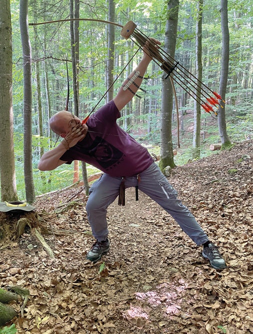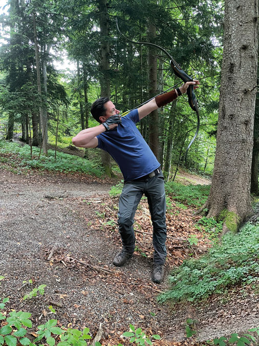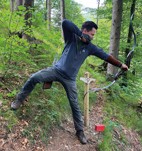 Wichtig ist dabei, dass das T, gebildet aus Schultern und Oberkörper, immer erhalten bleibt. Die richtige Körperhaltung muss vor dem Vollauszug eingenommen und während des Schusses beibehalten werden. Beim Schuss selbst bewegen sich nur mehr die Arme. Allerdings wird die Sache im Gelände etwas komplizierter. Durch unterschiedliche Abschusspositionen ist es oft sehr schwierig, das T auch beizubehalten. Deshalb muss man sich beim Bergauf- oder Bergabschießen bewusst darauf konzentrieren, dass das T auch erhalten bleibt.