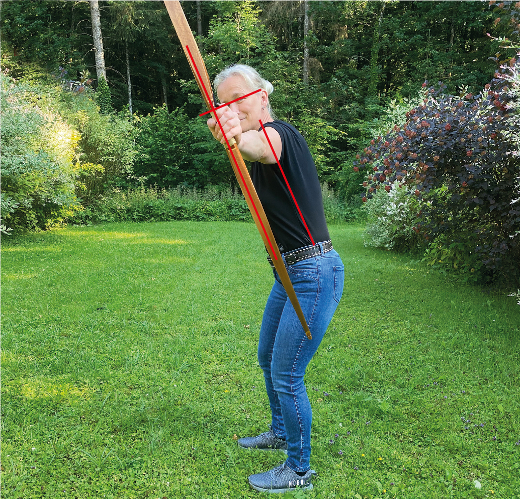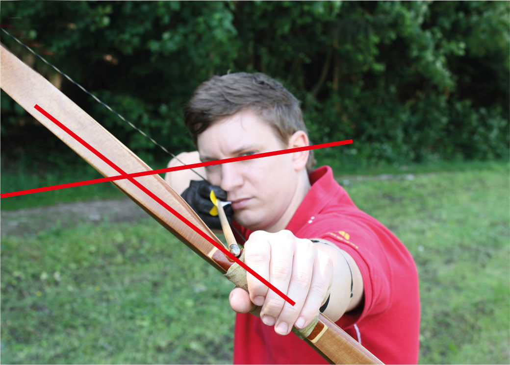 Es gibt so manche Erklärung, warum man den Bogen umlegen soll oder muss. Ein Argument ist, dass der Pfeil beim Langbogen nicht von der kleinen Pfeilauflage, was eigentlich nur ein Pfeilbett ist, herunterfällt. Das kann man zwar bei dem einen oder anderen Anfänger sehen, ein fortgeschrittener Schütze hat damit aber wenig bis keine Probleme. Andere meinen wieder, dass man das Ziel besser sehen kann, wenn der Bogen schräg gehalten wird. Letzteres Argument hat einiges für sich, ist aber nicht ganz zu Ende gedacht.