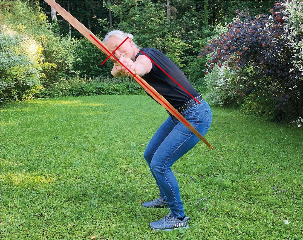 Das passiert nun so, dass man zum einen in die Knie geht, aber auch den Oberkörper in gleicher Weise beugt. Und auch der Bogen muss dabei umgelegt werden. Im Idealfall sind Oberkörper, Unterschenkel und Bogen parallel. Je nachdem, wie tief man sich bücken muss, variiert der Winkel.