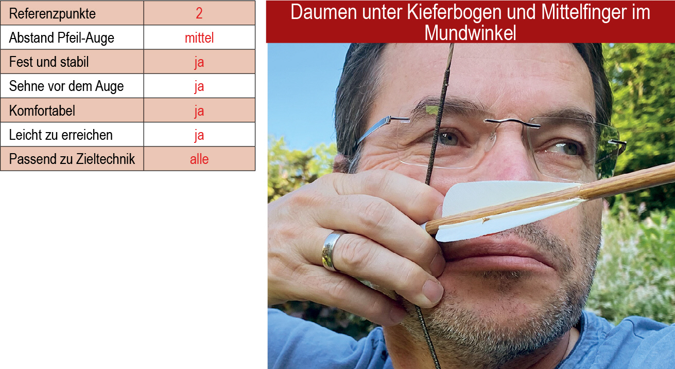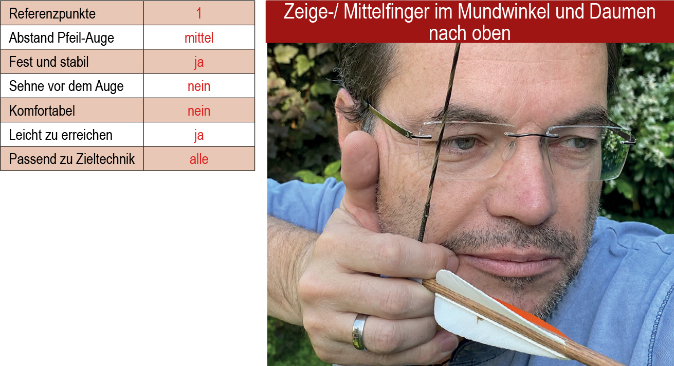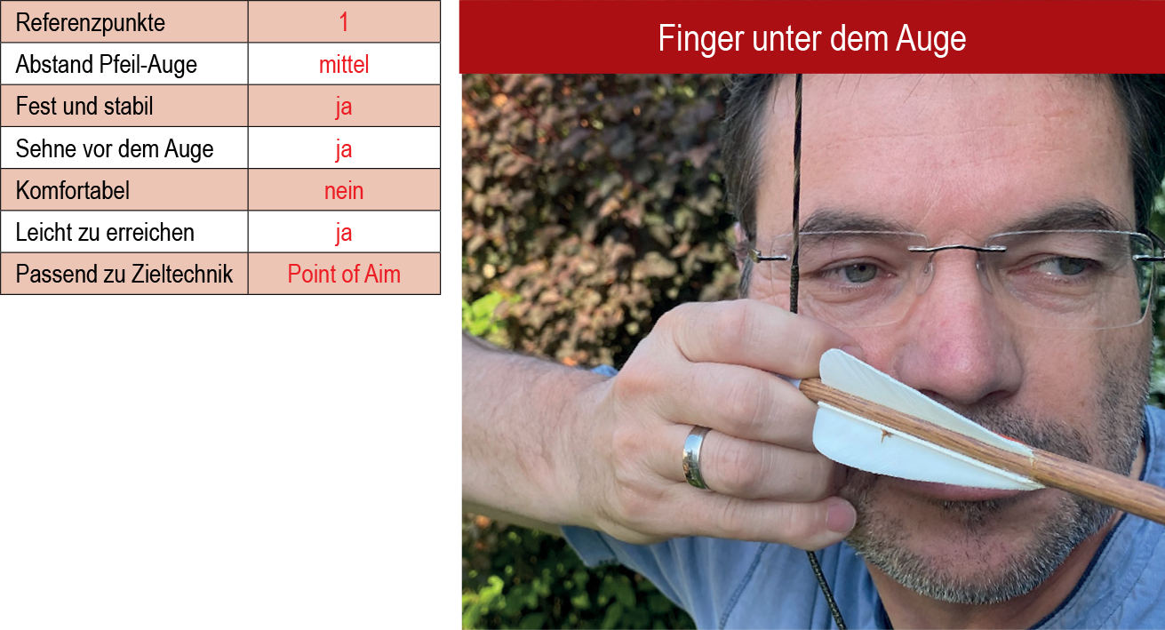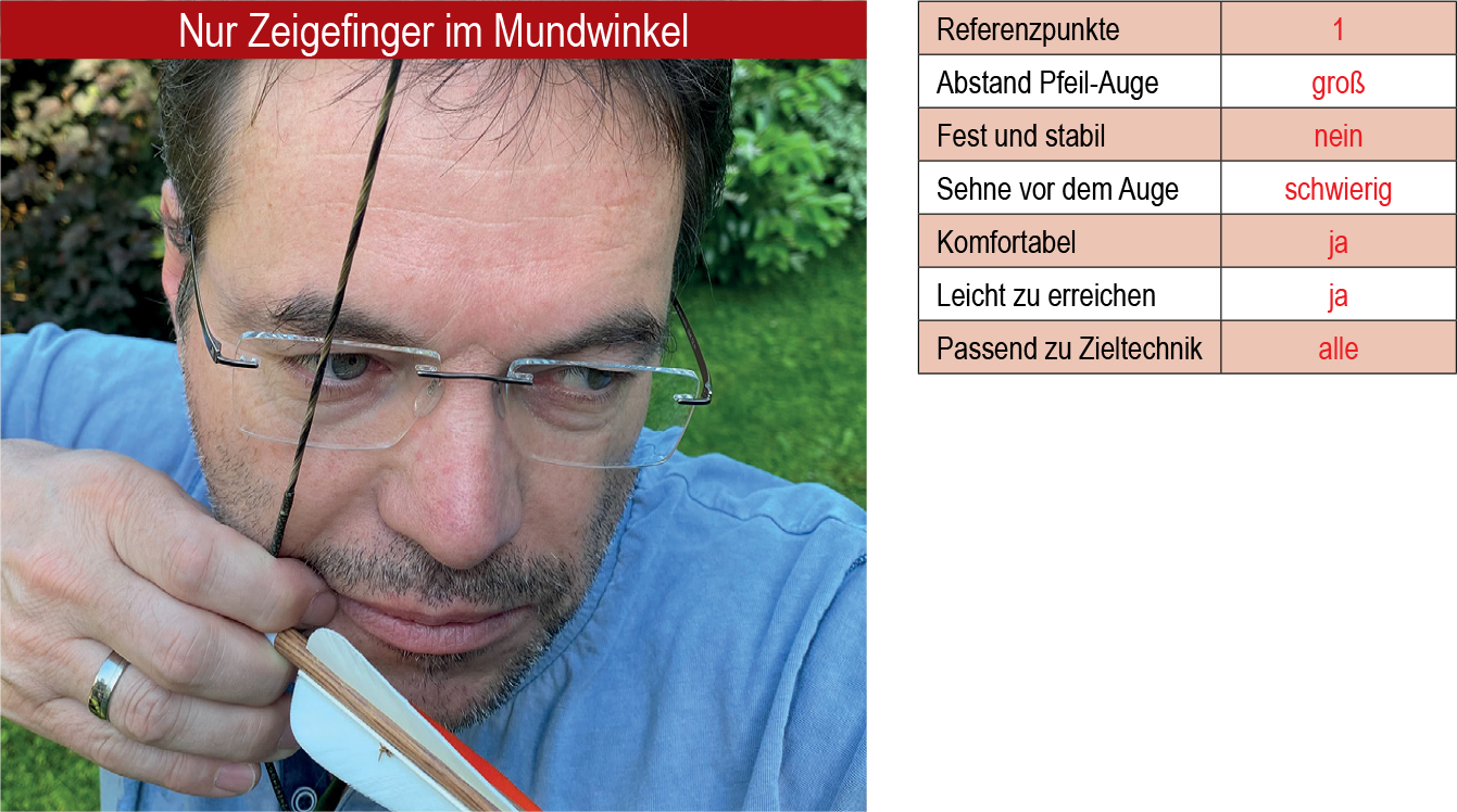 Schauen wir uns nun einige Varianten von Ankerpunkten an und versuchen aufgrund von einigen Kriterien einzuordnen, welche Vor- und Nachteile die einzelnen haben. Natürlich passt nicht jede Variante zu jedem Schützen. Aber wenn man die unten stehenden Kriterien betrachtet, könnte sich eventuell eine Variante als die Ideale herauskristallisieren.
