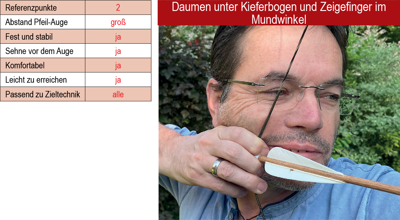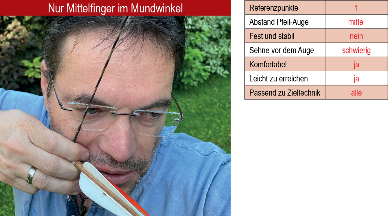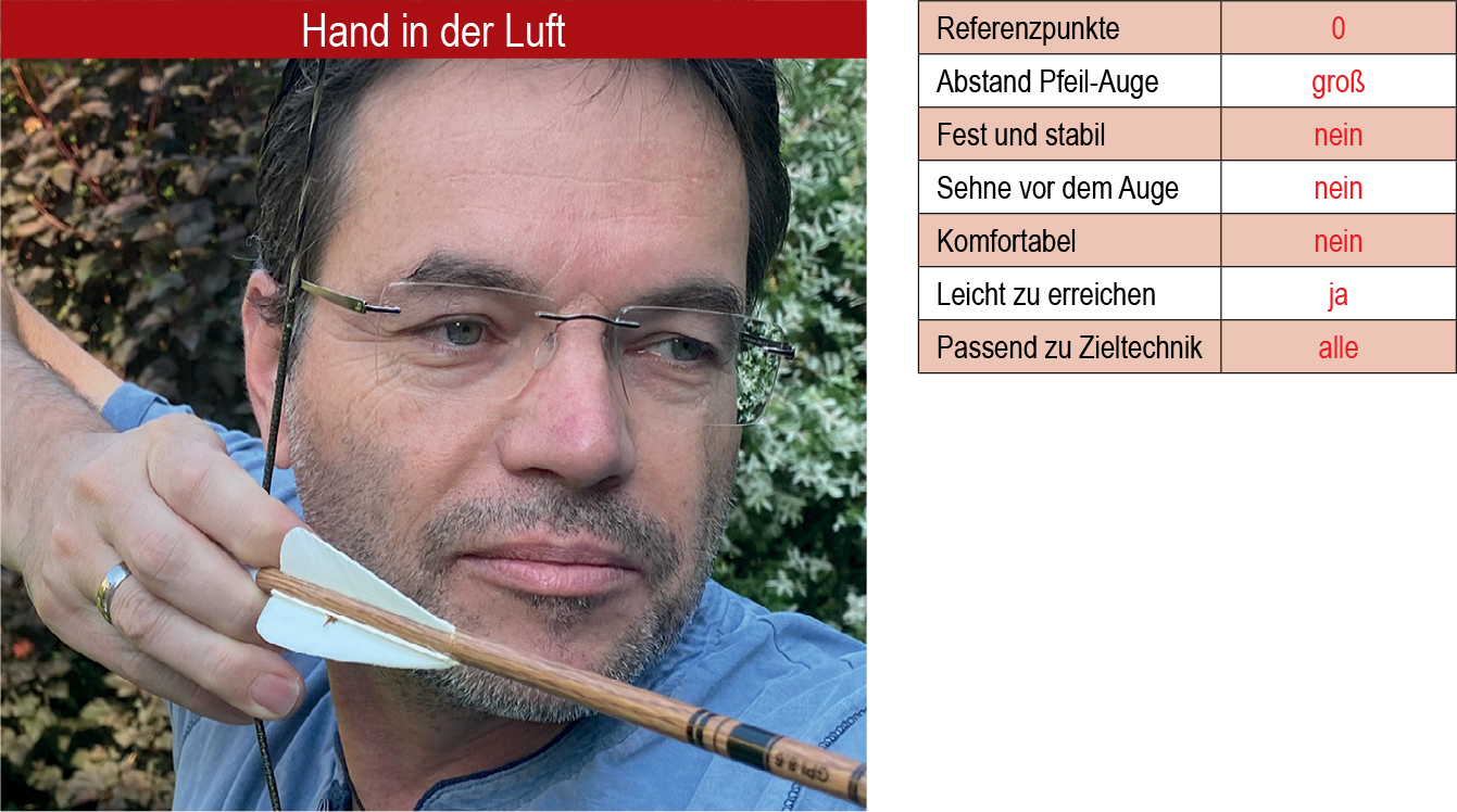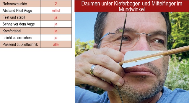 Schauen wir uns nun einige Varianten von Ankerpunkten an und versuchen aufgrund von einigen Kriterien einzuordnen, welche Vor- und Nachteile die einzelnen haben. Natürlich passt nicht jede Variante zu jedem Schützen. Aber wenn man die unten stehenden Kriterien betrachtet, könnte sich eventuell eine Variante als die Ideale herauskristallisieren.