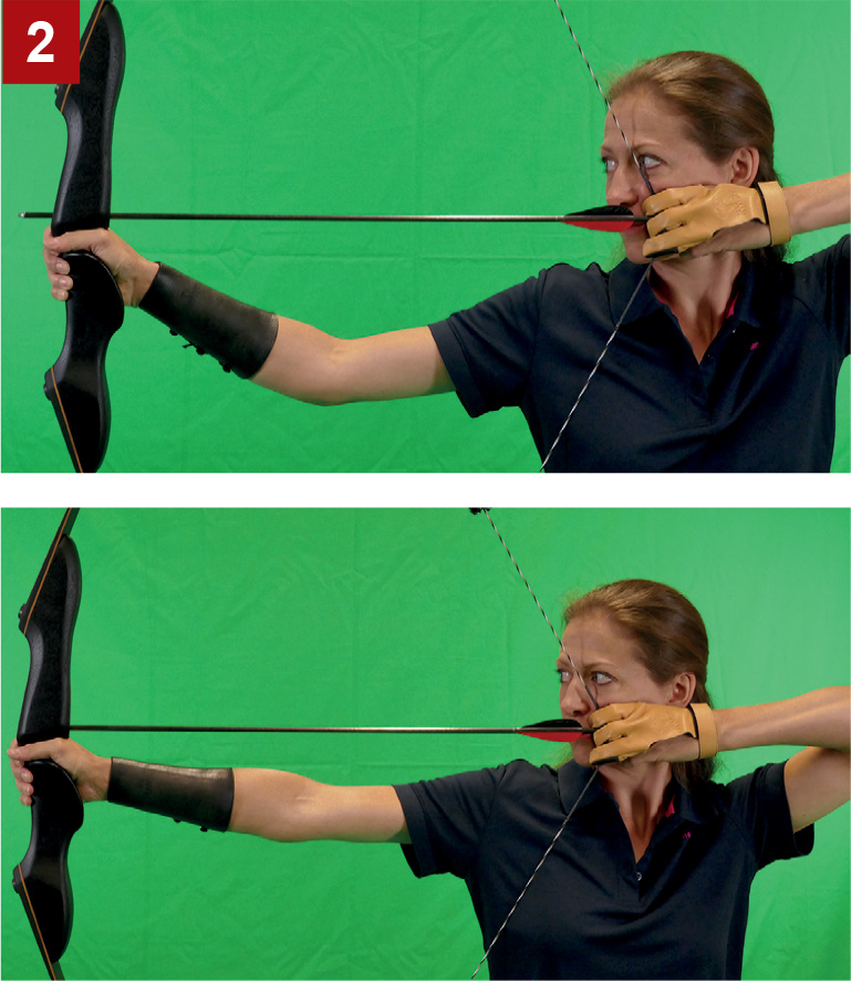 Ein weiterer Punkt muss sein, dass man den Ankerpunkt sehr leicht erreichen kann. Gerade Schützen, die umlernen, haben zu Beginn große Probleme zügig an den Punkt zu kommen. Oft geht das Gesicht zur Zughand und nicht umgekehrt. Auch sieht man, dass der Ankerpunkt lange gesucht wird. Es braucht etwas Übung, bis man in einem Zug in die richtige Position kommt. Es muss eine Bewegung sein, die man unterbewusst durchführt, also nicht mehr nachdenken muss: Wie, wann, wo?