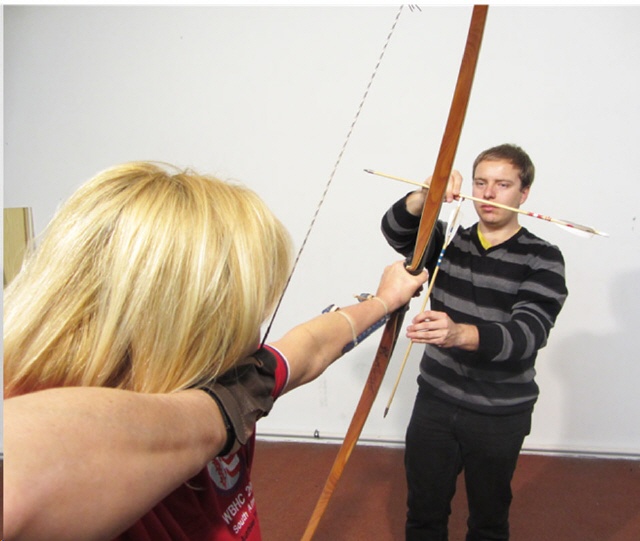 Kontrolle der Bogenhaltung Ein Pfeil wird vom Partner an den Bogen, der andere an die Augenachse gelegt. Die Pfeile müssen dann einen rechten Winkel bilden. |