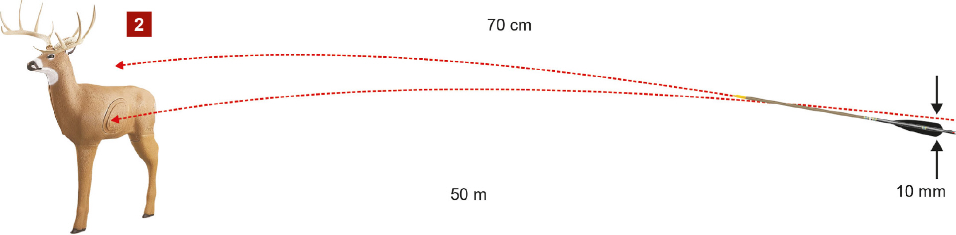 Oft passiert es, dass man zu wenig zieht. Dadurch hat der Pfeil eine geringere Geschwindigkeit und trifft dadurch logischerweise tiefer. Je weiter die Schussentfernung ist, desto größer ist die Abweichung.