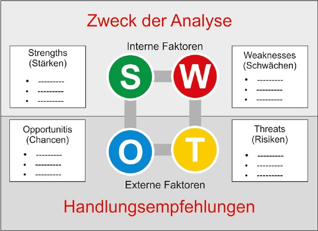 Die vier Kategorien kann man als Matrix darstellen. Auf den Bogensport angewandt, lassen sich daraus Maßnahmen und Strategien fürs weitere Handeln ableiten. Die beiden Faktoren Strenghts (Stärken) und Weaknesses (Schwächen) sind der Ausgangspunkt. Wenn man diese Analyse durchgeführt hat, können daraus Handlungsempfehlungen abgeleitet werden. Welchen Möglichkeiten (Opportunities) habe ich dabei und auf welche Probleme muss ich dabei achten. Das alles wird dann in einem Aktionsplan umgesetzt. Das heißt im Einzelnen, dass man sich überlegen muss, wie und womit man sich verbessern kann.