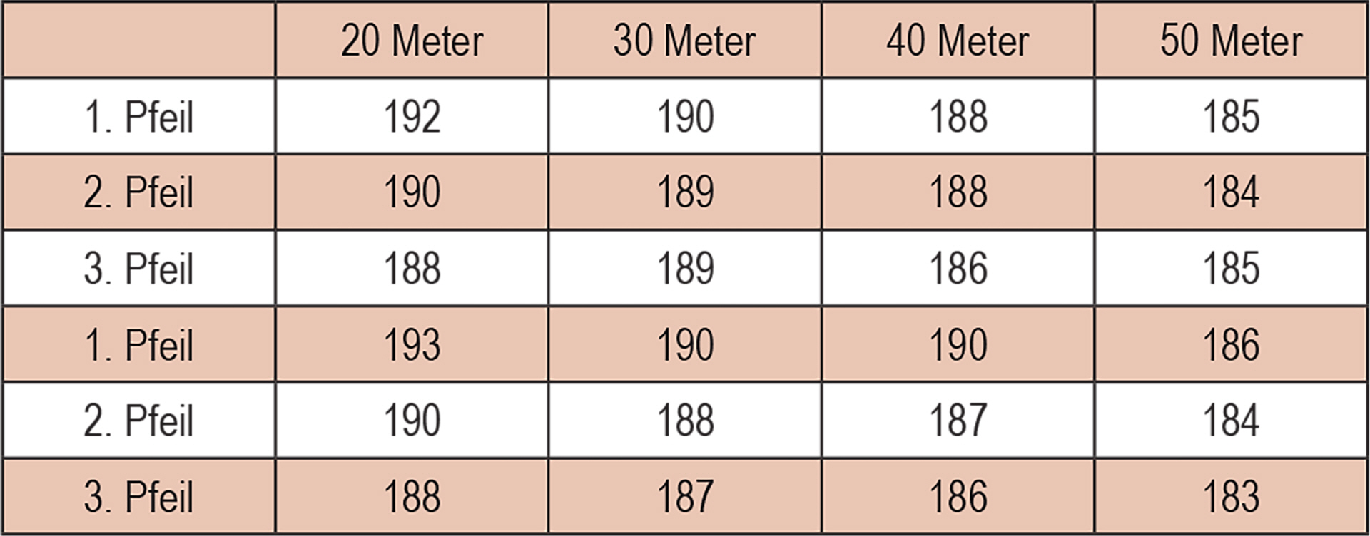 Dabei schießt man auf unterschiedliche Entfernungen. Wichtig ist, dass es keine Rückkoppelung gibt. Man sollte nicht die Geschwindigkeiten der einzelnen Pfeile sofort sehen. Das führt dazu, dass man bei zu geringer Geschwindigkeit beim nächsten Pfeil mehr auszieht. Das Ergebnis des ersten Pfeils hätte also Auswirkungen auf den zweiten Pfeil.