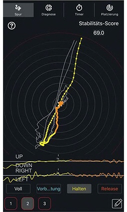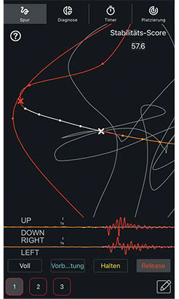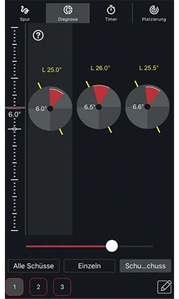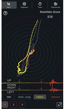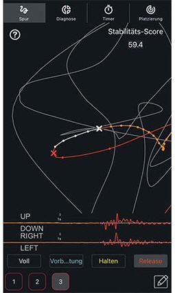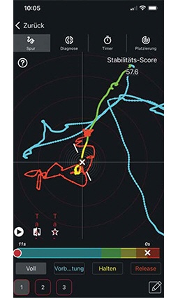 Das Tool ist nur dann sinnvoll, wenn man die Daten auch richtig interpretieren kann. Über eine App kann das Ding gesteuert werden. Die Bewegungen in den einzelnen Phasen werden als farbige Linien auf dem Handy oder Tablet dargestellt. Hier sieht man in der Gesamtübersicht zuerst ein eher wirres Durcheinander von Linien. Erst wenn man sich die einzelnen Phasen genauer ansieht, kann man Details erkennen. Um eine Analyse durchführen zu können, muss man einige Male auf das gleiche Ziel schießen. Im Schussablauf zeigt Mantis X8 drei farbig gekennzeichnete Phasen.