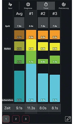 Neben der Bewegung, die man beim Schießen macht, ist auch der Zeitraum, den man für die einzelnen Phasen braucht, von Bedeutung. Ist beispielsweise der orange Bereich in der Phase halten sehr lang, besteht die Gefahr, dass die Rückenspannung wieder zusammenfällt. Ist sie immer unterschiedlich lang, kann man davon ausgehen, dass einmal mit und einmal ohne Rückenspannung geschossen wird.