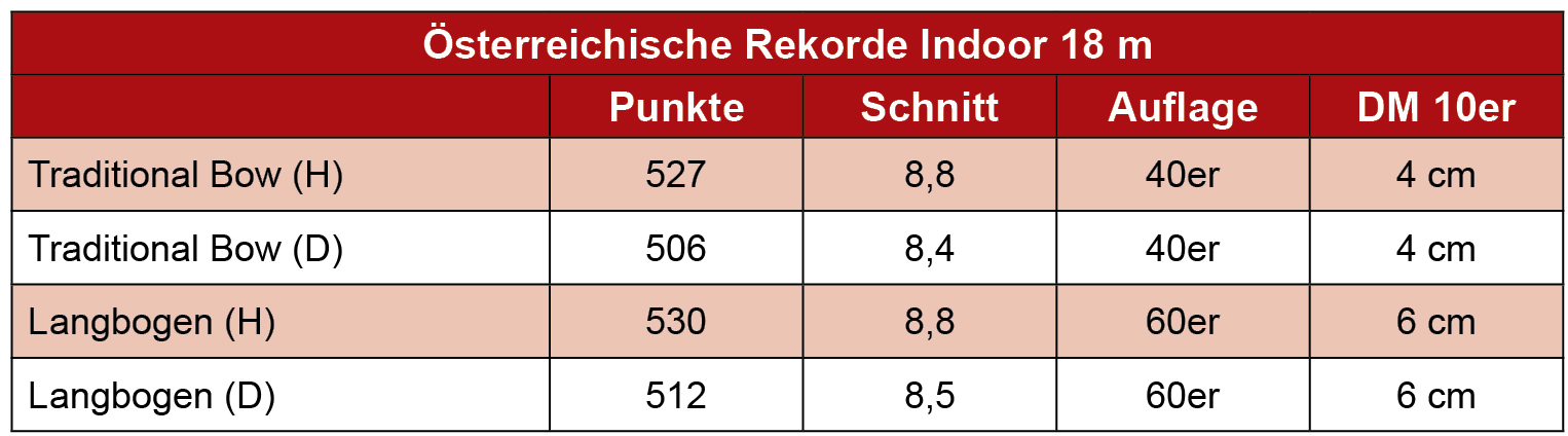 In Österreich werden Indoor-Meisterschaften nach World Archery geschossen. Dabei sind die Klassen Compound, Olympic Recurve, Barbow, Instinctive Bow (entspricht in etwa dem Traditional Recurve der IFAA) und Langbogen startberechtigt. Hier kann man dann sein eigenes Niveau an den Besten messen. Die untenstehende Tabelle zeigt die Rekorde in den traditionellen Klassen. Um mit dem Instinctive Bow beispielsweise auf diesem Level zu sein, hat man einen Streukreis von 102 Millimeter bei den Herren, bzw. 136 bei den Damen.