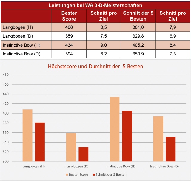 Etwas schwieriger ist es schon, den Vergleich mit 3-D-Schützen zu machen. Nimmt man die Ergebnisse z.B. der WBHC (World Bowhunter Championships) oder EBHC (European Bowhunter Championships) der IFAA kommt man der Sache schon etwas näher.