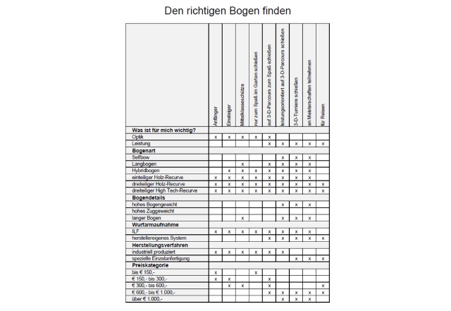 Immer wieder merke ich in meinen Seminaren, dass Schützen das für sie falsche Equipment haben. Sie sind dann todunglücklich, wenn man ihnen die Schwachstellen aufzeigt. Wenn man sich einen neuen Bogen kauft, sollte man daher systematisch vorgehen. Der rechts abgebildete Kriterienkatalog soll dabei helfen, den Richtigen zu finden.