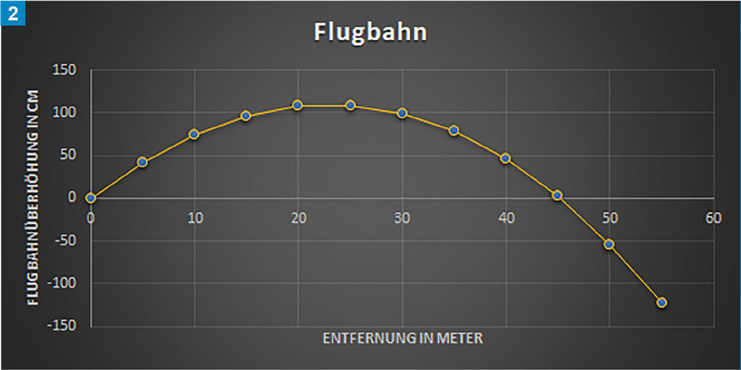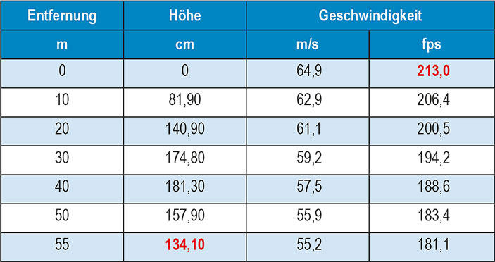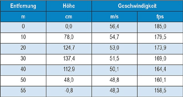 Durch das wesentlich höhere Pfeilgewicht hat der Pfeil um 20 fps weniger V0 als in Tabelle 1 und erreicht bereits bei 45 m die Nulllinie.