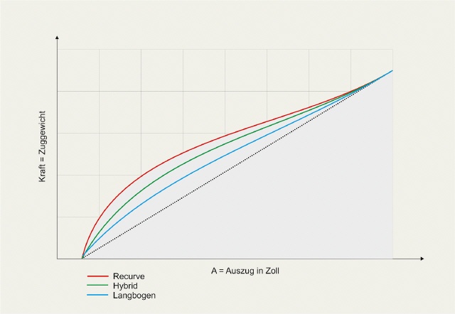 Idealerweise sollte die Kurve bei guten Wurfarmen sich bei Vollauszug an die Referenzlinie anschmiegen (Bild nächste Seite oben). Ein guter Bogen sollte zu Beginn einen steileren Anstieg dieser Kurve haben. Auch müssen sich Langbogen, Hybridbogen und Recurve unterscheiden.