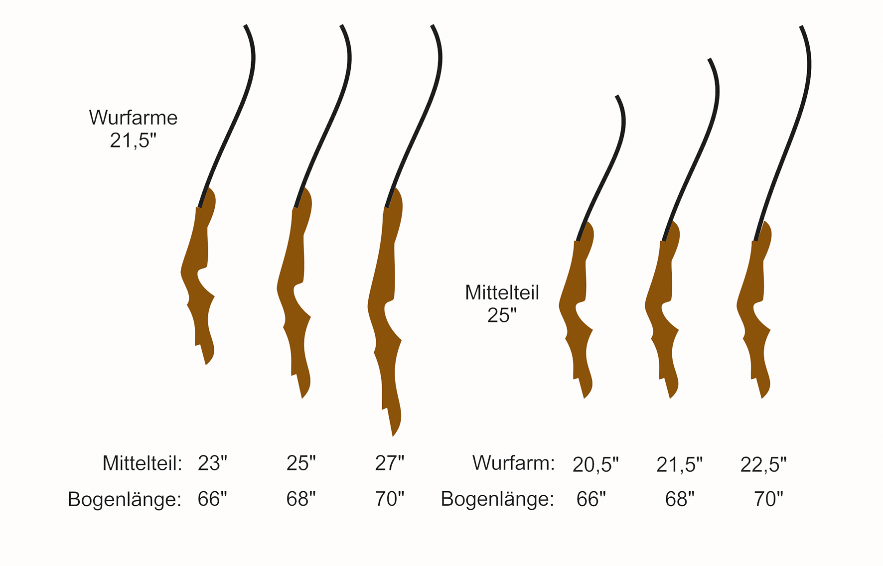 Ein langes Mittelteil mit kurzen Wurfarmen arbeitet besser als ein kurzes Mittelteil mit langen Wurfarmen. Der Grund ist, dass lange Wurfarme stärker schwingen. Es ist wichtig, das richtige Verhältnis zwischen Mittelteil- und Wurfarmlänge an den jeweiligen Schützen anzupassen, inklusive des Verhältnisses von Auszug und Wurfarmlänge. Bei einem 21-Zoll-Mittelteil werden Wurfarme, die eine gesamte Bogenlänge von 66 Zoll ergeben, für die meisten Schützen ausreichend sein.