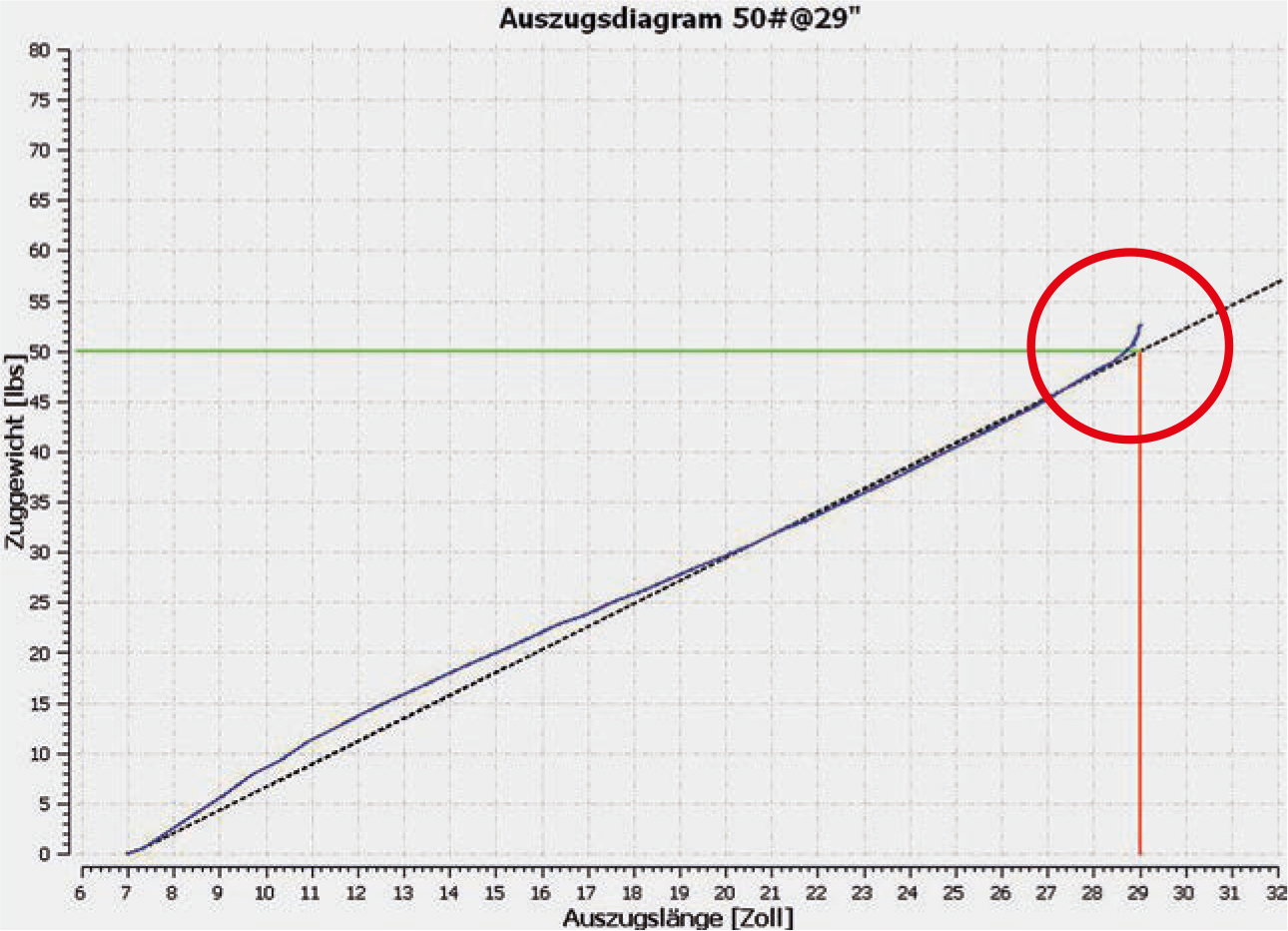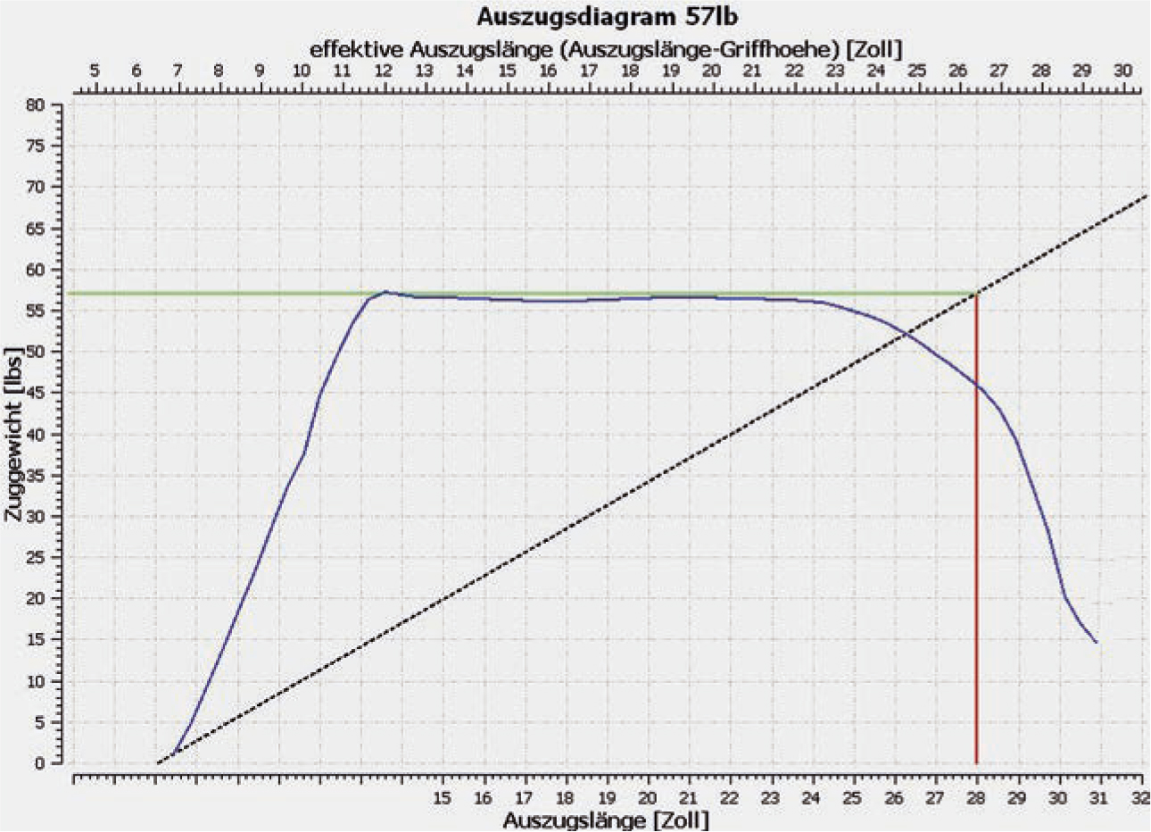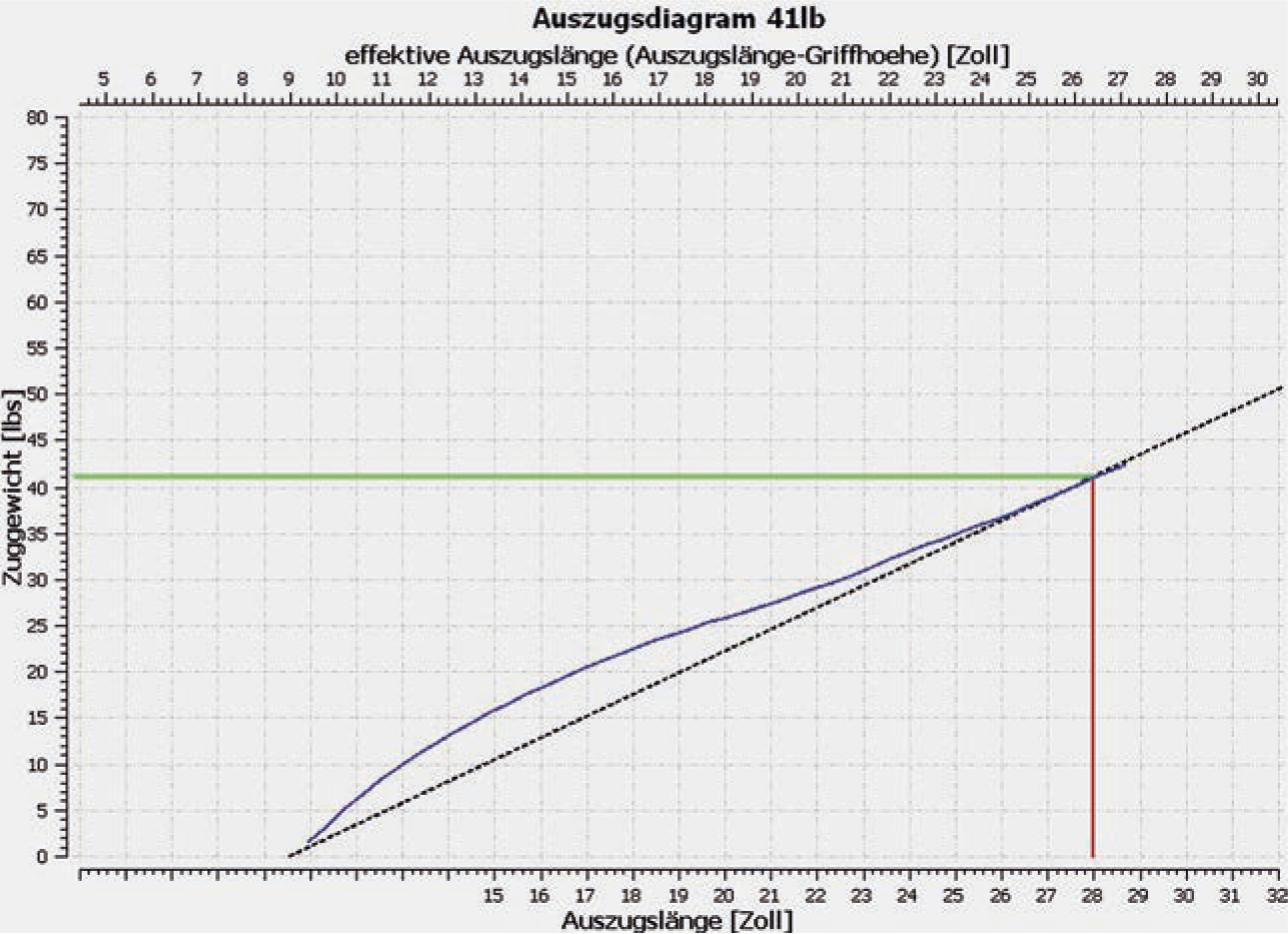 Ein kurzer Bogen, der bis an die Grenzen seiner Belastbarkeit gezogen wird, stackt und lädt sich mit überproportional viel Kraft pro Zoll auf. Daher fühlt er sich unangenehm im Vollauszug an. Hier spricht man von einer Stack-Linie, also dem Ende der gleichmäßigen Federbiegung, die Kurve bricht nach oben aus.