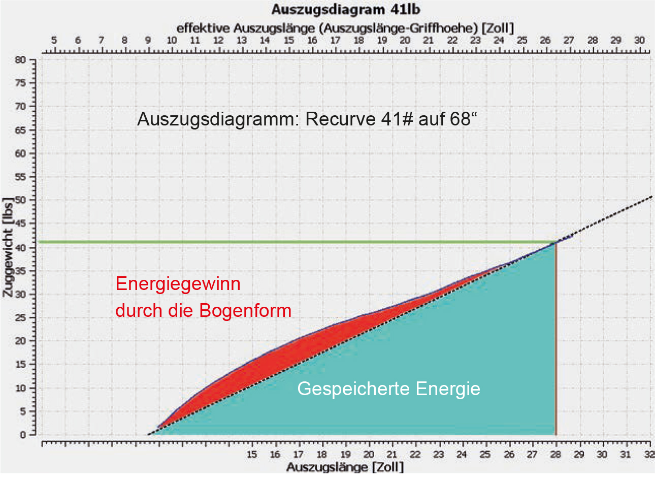 In den Grafiken sieht man die gespeicherte Energie des Bogens (Epot) als Fläche unter der Auszugskurve.