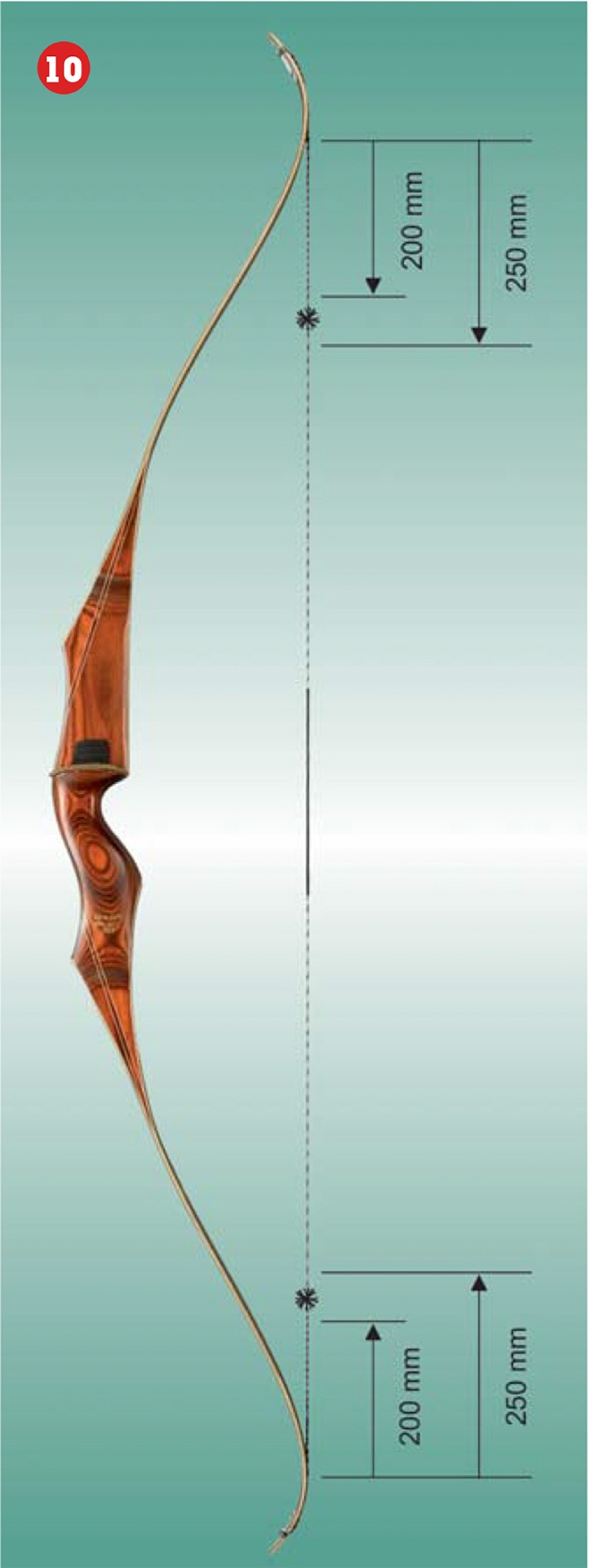 Die Pfeillänge wird am besten – unabhängig von den Vorgaben einer Organisation – so festgestellt, dass man sie von der Sehnenkerbe bis zur Rückseite des Bogens misst. Um sicher zu gehen, dass die Pfeile nicht zu kurz werden, wenn man mal zu weit zieht, kann man noch 1 bis 1,5 Zentimeter dazu geben.