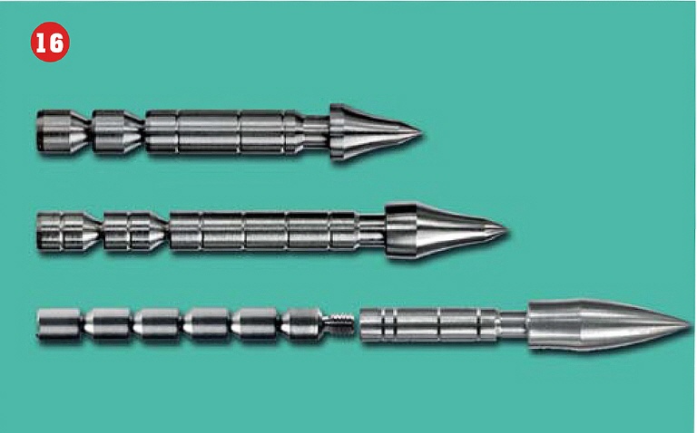 A) Holzpfeile: Hier gibt es für die Durchmesser 5/16, 11/32 und 23/64 Spitzengewichte von 70 bis 125 Grain. Einige Hersteller verwenden dabei Ringe auf der Spitze, um das Gewicht schnell ablesen zu können.