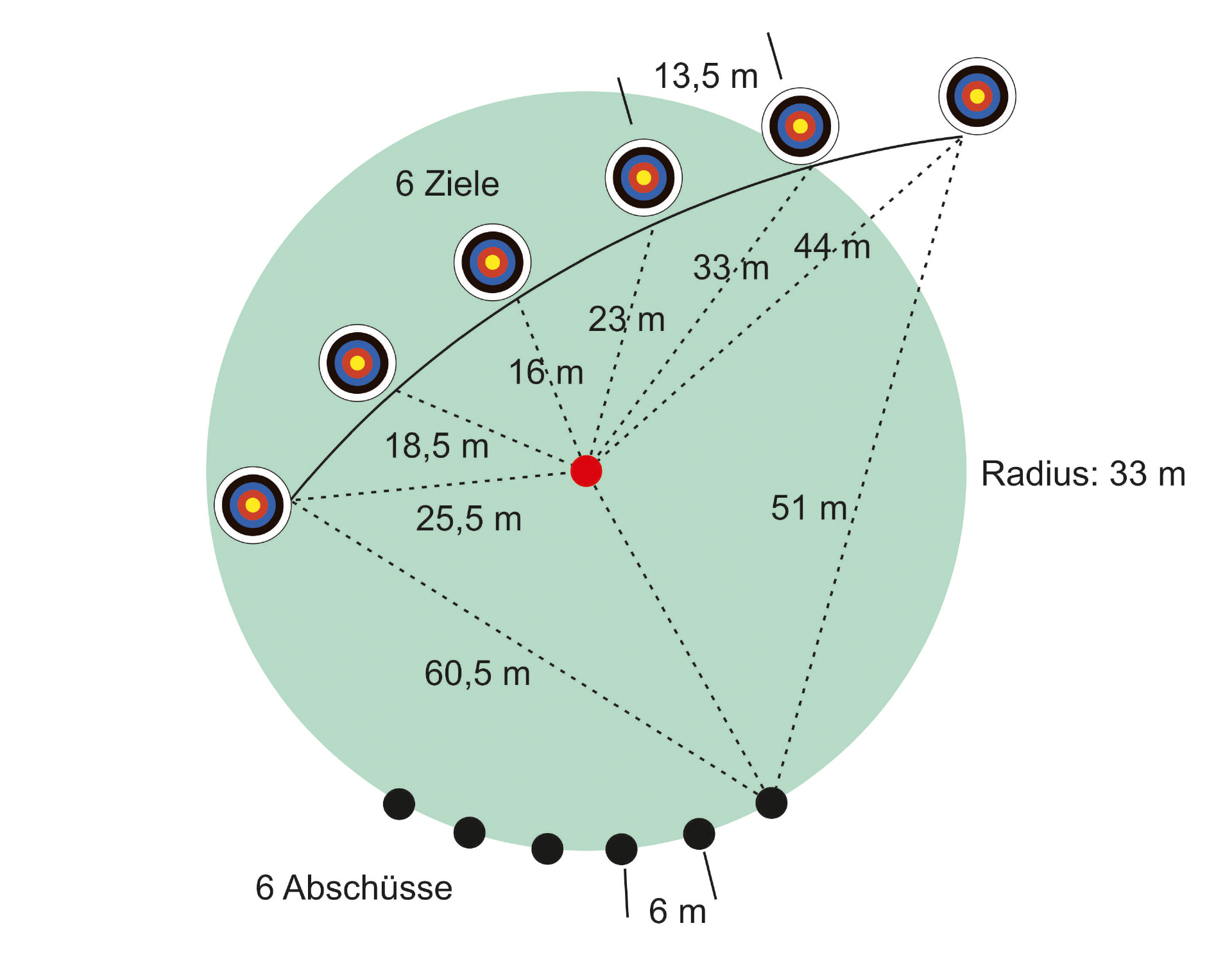 Die Runde besteht aus sechs Scheiben und sechs Abschüssen, die ausgehend von einem Grundkreis von 33 Metern Durchmesser angeordnet sind. Mit Hilfe von Dreiecken, die alle mit einem Eck den Mittelpunkt berühren, kann man die Abschüsse und Positionen der Standpunkte ermitteln.