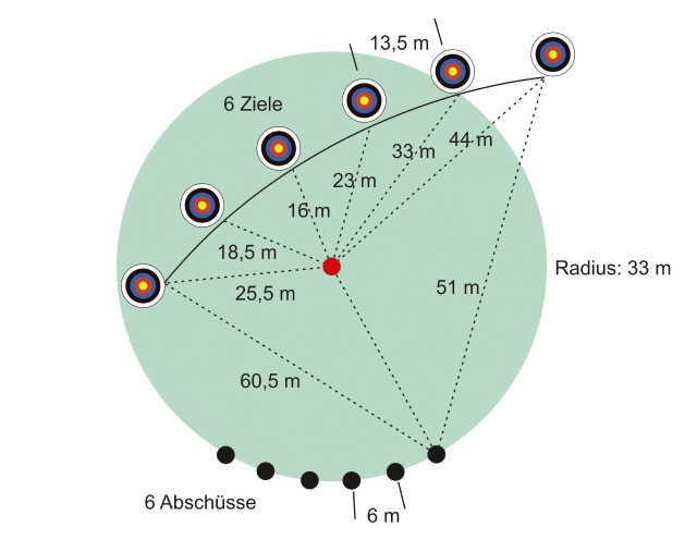 Wie steck man nun diese Runde aus? Man zieht einen Kreis mit ein 33 Meter langen Schnur. Ein wichtiger Punkt ist der Mittelpunkt des Kreises. Er muss gut gekennzeichnet sein. Auf diesem Kreis werden die Abschüsse in Abständen von 6,8 Metern markiert. Um die Scheiben in den richtigen Abständen aufzustellen, braucht man Schnüre mit genau der jeweiligen Seitenlänge der Dreiecke. Man beginnt mit der rechten Scheiben, also die am weitesten vom Mittelpunkt entfernt ist. Nimmt man nun eine Schnur mit 68,8 und eine mit 44,2 Meter, ergibt sich automatisch der Standort für die Scheibe. Ausgehend von der ersten Scheibe und dem Mittelpunkt, kann man nun jede Position der Scheiben mit zwei Schnüren sehr einfach bestimmen.