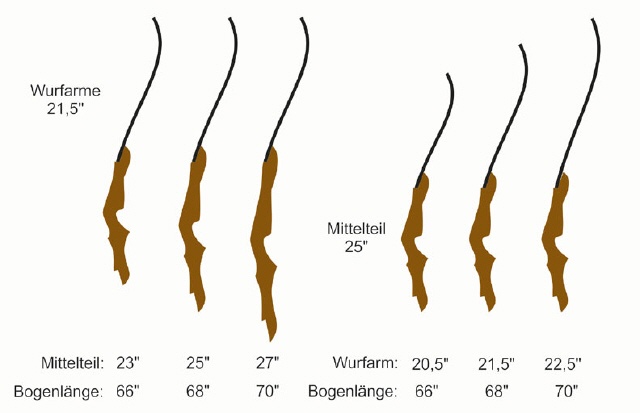 Welche Bogenlänge man schießt, hängt davon ab, was man gerne möchte. Ein langer Bogen ist fehlerverzeihender als ein kurzer. Zudem sind sie auch schwerer. Dafür ist er aber bei gleicher Zugstärke auch langsamer.