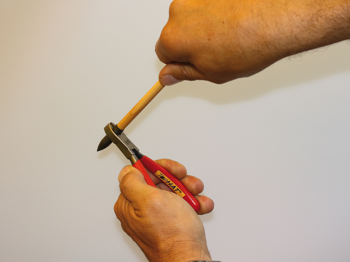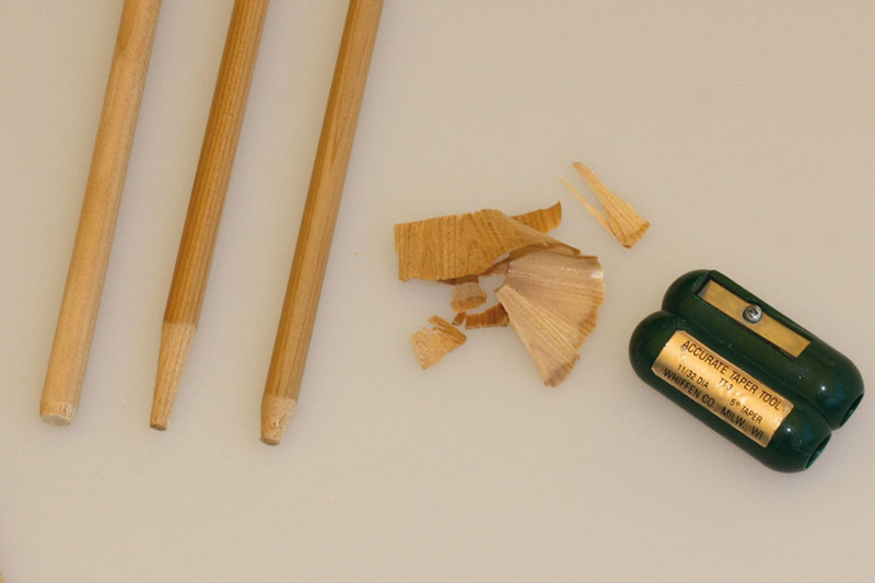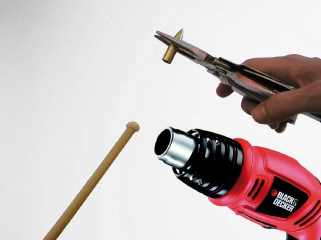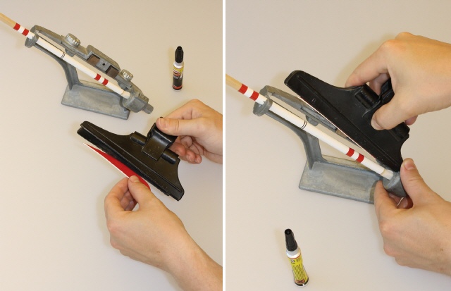 Als Letztes wird die Spitze aufgesetzt. Bei Klebepitzen, die also einen Kleber brauchen, wurden die besten Erfahrungen mit Heißkleber gemacht. Er ermöglicht es auch, dass abgebrochene Spitzen sehr einfach vom Holz befreit und wieder verwendet werden können.