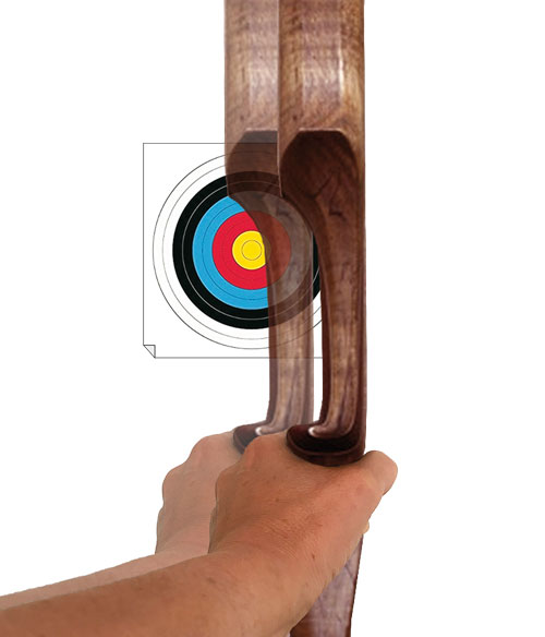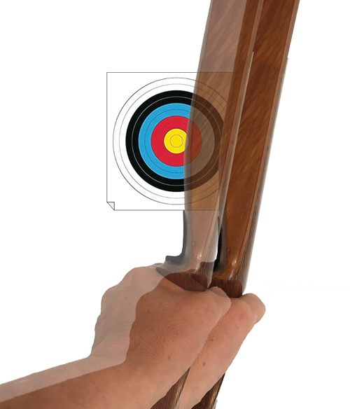 Bei einem Langbogen oder einem Recurvebogen mit einer kleiner Pfeilauflage kann der obere Wurfarm das Bild eines Auges verdecken. Das Ziel bleibt zwar sichtbar, aber die räumliche Wahrnehmung geht verloren. Genau das stellt das Hauptproblem dar. Wer mit einem Zielsystem wie der Pfeilspitze (Point of Aim) arbeitet, hat hier keine Schwierigkeiten. Instinktivschützen oder Gap Shooter sollten das Ziel jedoch räumlich sehen können.