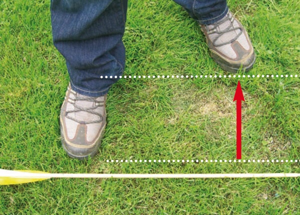 Man stellt sich zuerst parallel zum Ziel. Das kann man mit einem Pfeil, den man genau an die Fußspitzen anlegt, überprüfen.