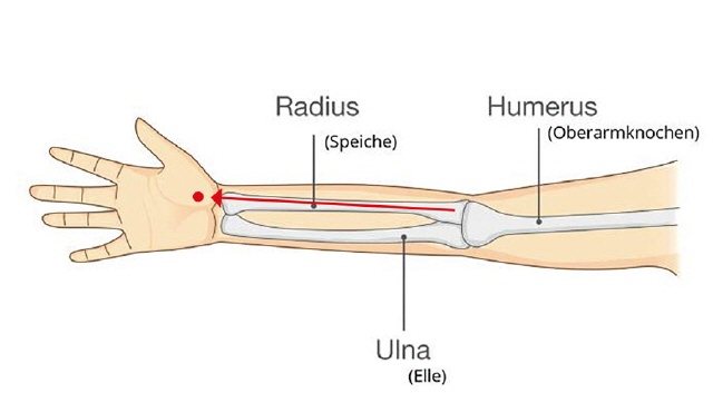 Die Hand steht so, dass die Lebenslinie senkrecht steht. Der Druckpunkt sollte in der Verlängerung des Unterarmknochens (Radius) liegen. Damit liegt er am Daumenballen dort, wo der Radius in der Verlängerung herauskommen würde.