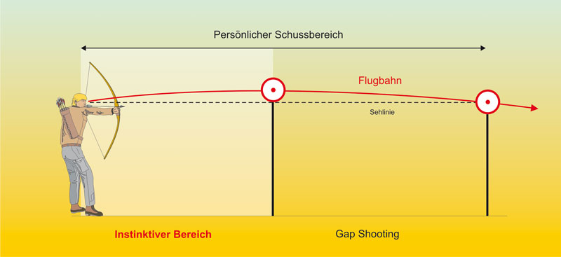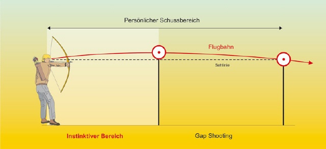 Hier schießt man nach Gefühl. Man hebt oder senkt den Bogenarm und versucht so, den richtigen Abschusswinkel zu finden. Dabei denkt man quasi die Flugbahn (Gap = Lücke) voraus. Man braucht jedoch die räumliche Lage des Pfeils (nicht die Spitze) zum Ziel.
