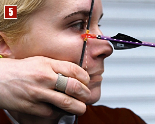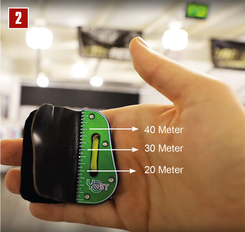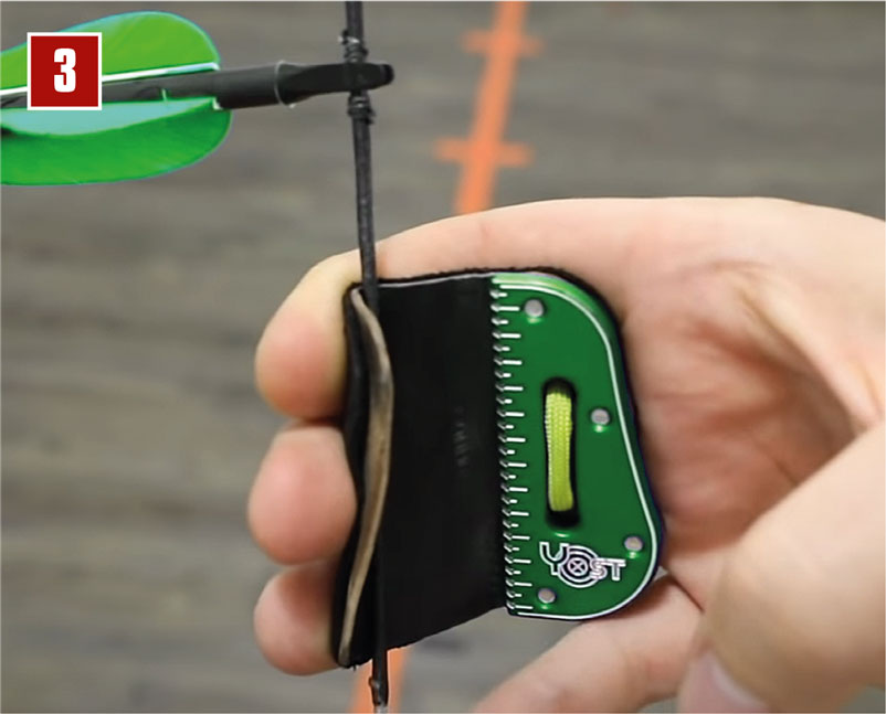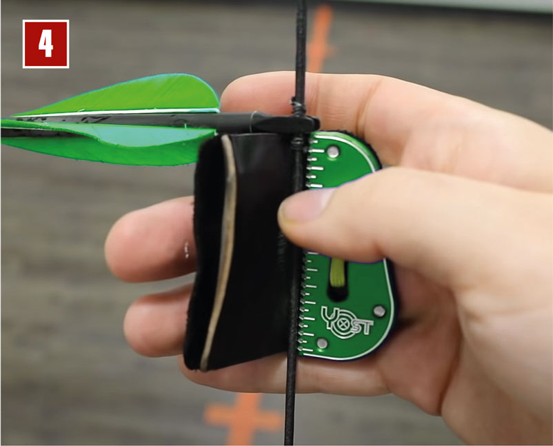 Hat man nun die Entfernung, muss man mit dem Tab um den vorgegebenen Wert die Sehnen unterhalb des Nockpunkts greifen. Je kürzer die Entfernung ist, desto weiter muss man nach unten (Bild 3). Und je weiter man schießt, desto näher am Nockpunkt positioniert man das Tab (Bild 4).