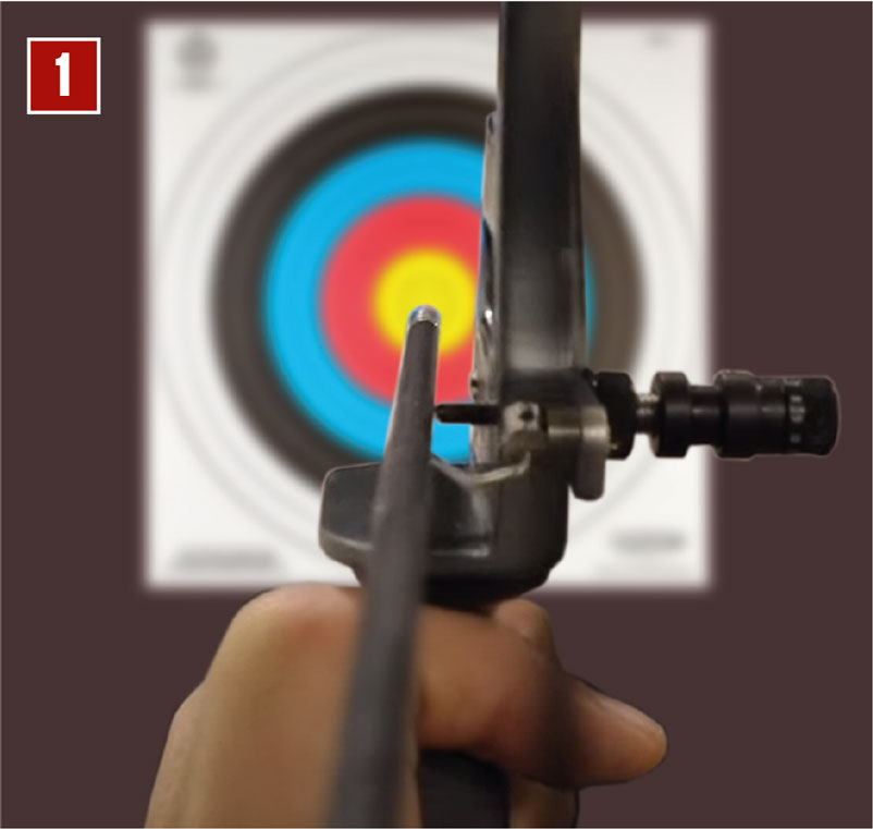Gezielt wird immer mit der Pfeilspitze. Und sie wird immer genau in die Mitte gehalten. Das funktioniert, weil sich beim Stringwalking die Auszugslänge und der Abschusswinkel für unterschiedliche Entfernungen ändern. Für den Schützen ist nur wichtig, dass er die Entfernung richtig geschätzt hat. Hat man die richtig geschätzt und die Schusstechnik passt auch noch, müsste der Treffer genau in der Mitte sein (Bild 1).