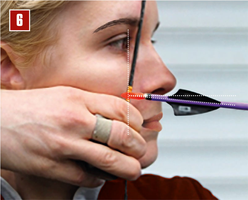 Zum Ankern hat jeder Schütze einen permanenten Ankerpunkt. Würde man diese Position auch verändern, spricht man allerdings von Face Walking, das hier nicht das Thema ist. Im Bild 5 und 6 wird immer mit dem Mittelfinger im Mundwinkel geankert.