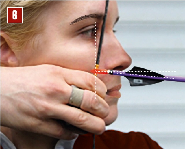 Wenn man weiter schießen will, nockt man den Pfeil näher am Nockpunkt ein. Dadurch zieht man weiter, der Pfeil hat mehr Geschwindigkeit und der Abschusswinkel des Pfeils zeigt mehr nach oben. Dadurch trifft man höher (Bild 6).