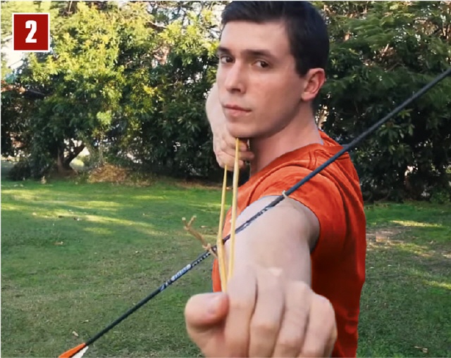 Position 1 ist die normale Haltung, die ein Schütze mit Hypermobilität hat, wenn er schießen möchte. Dabei streift die Sehne wie schon dargestellt stark am Unterarm (Bild 2).