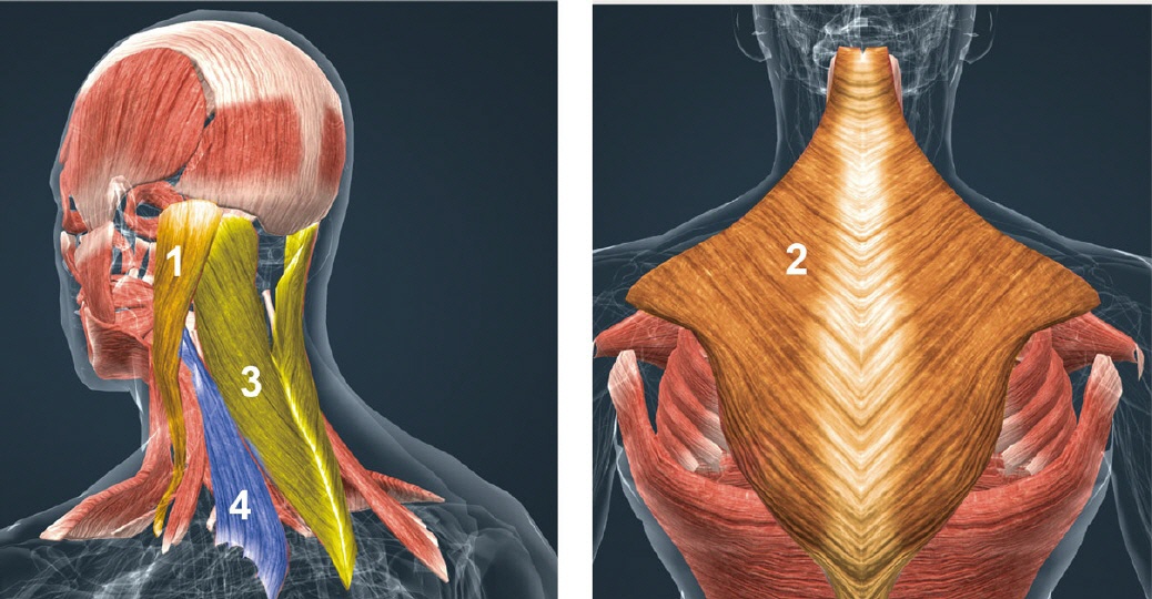 3) Splenius capitis (Riemenmuskel), 4) Levator scapulae (Schulterblattheber)