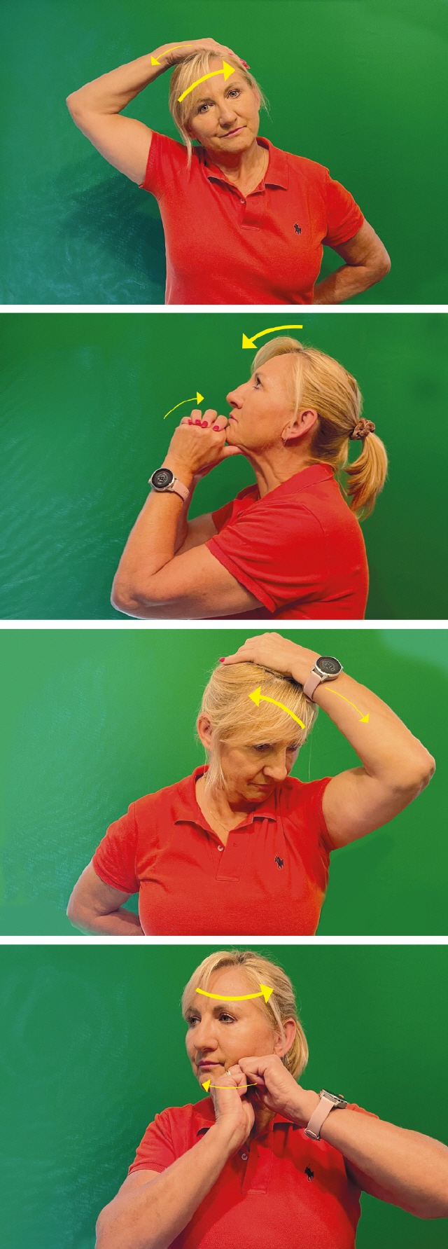 Der Kopf wird mit einer oder zwei Händen leicht in die gewünschte Richtung gezogen. Wichtig ist dabei, dass mit dem Kopf selbst relativ stark in die Gegenrichtung gedrückt wird.