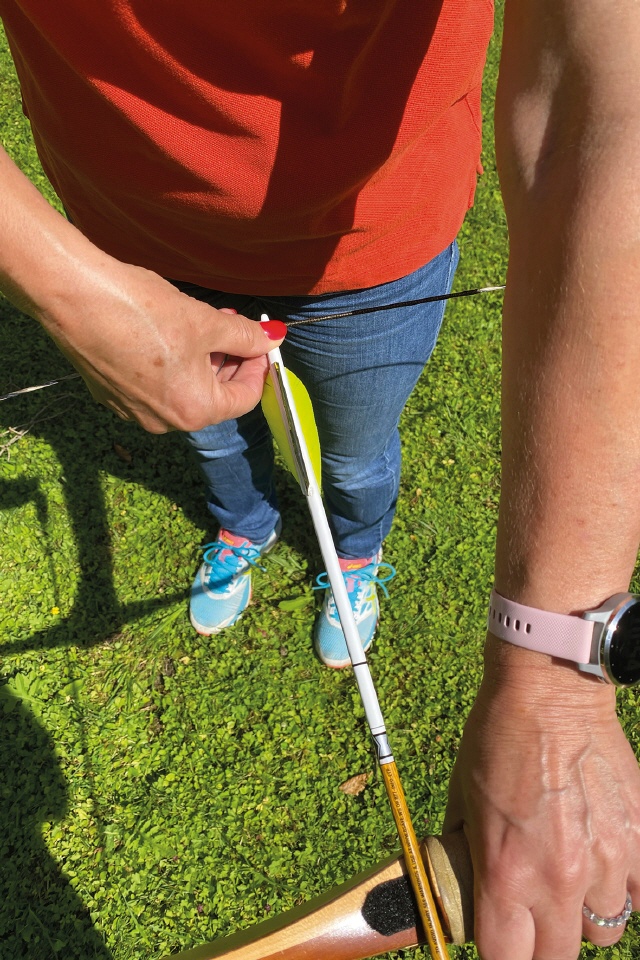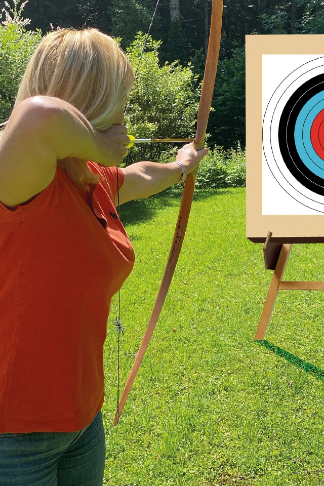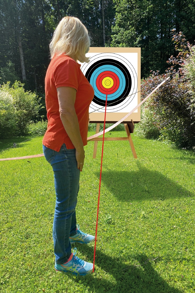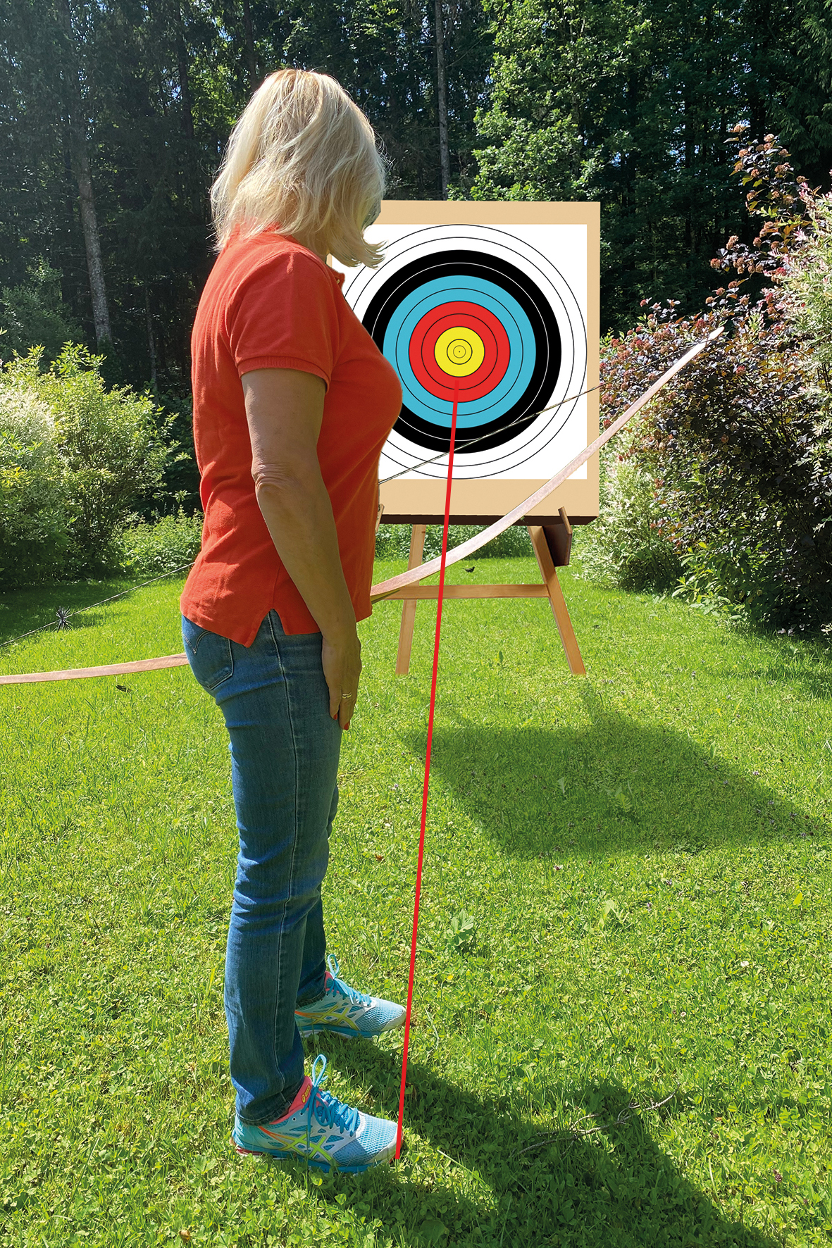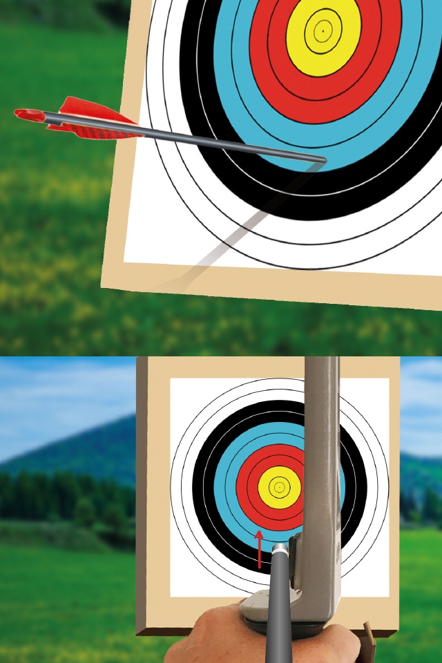Erklären: Wenn der Pfeil zu tief/zu hoch getroffen hat, muss man beim zweiten Pfeil das korrigieren.