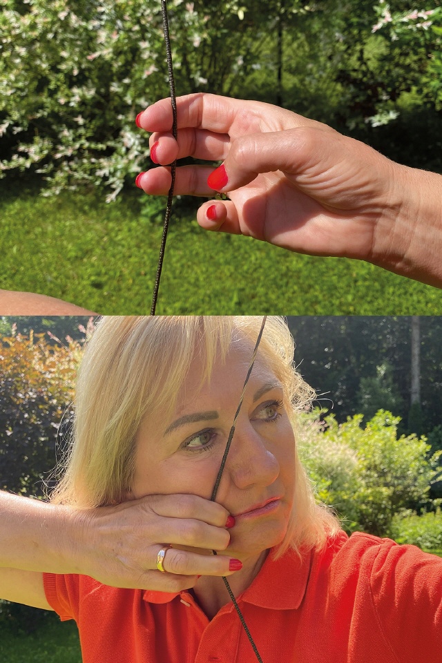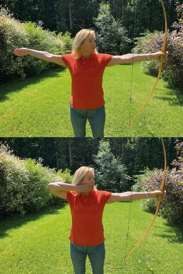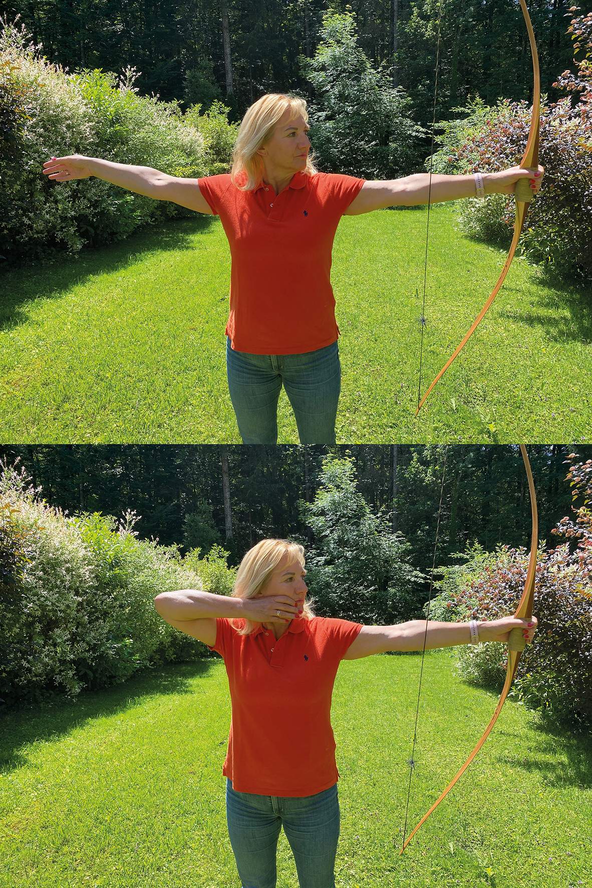 Schritt 4: Sehne greifen und ankern Vorzeigen, wie man Sehne greift und bis zum Ankerpunkt zieht.